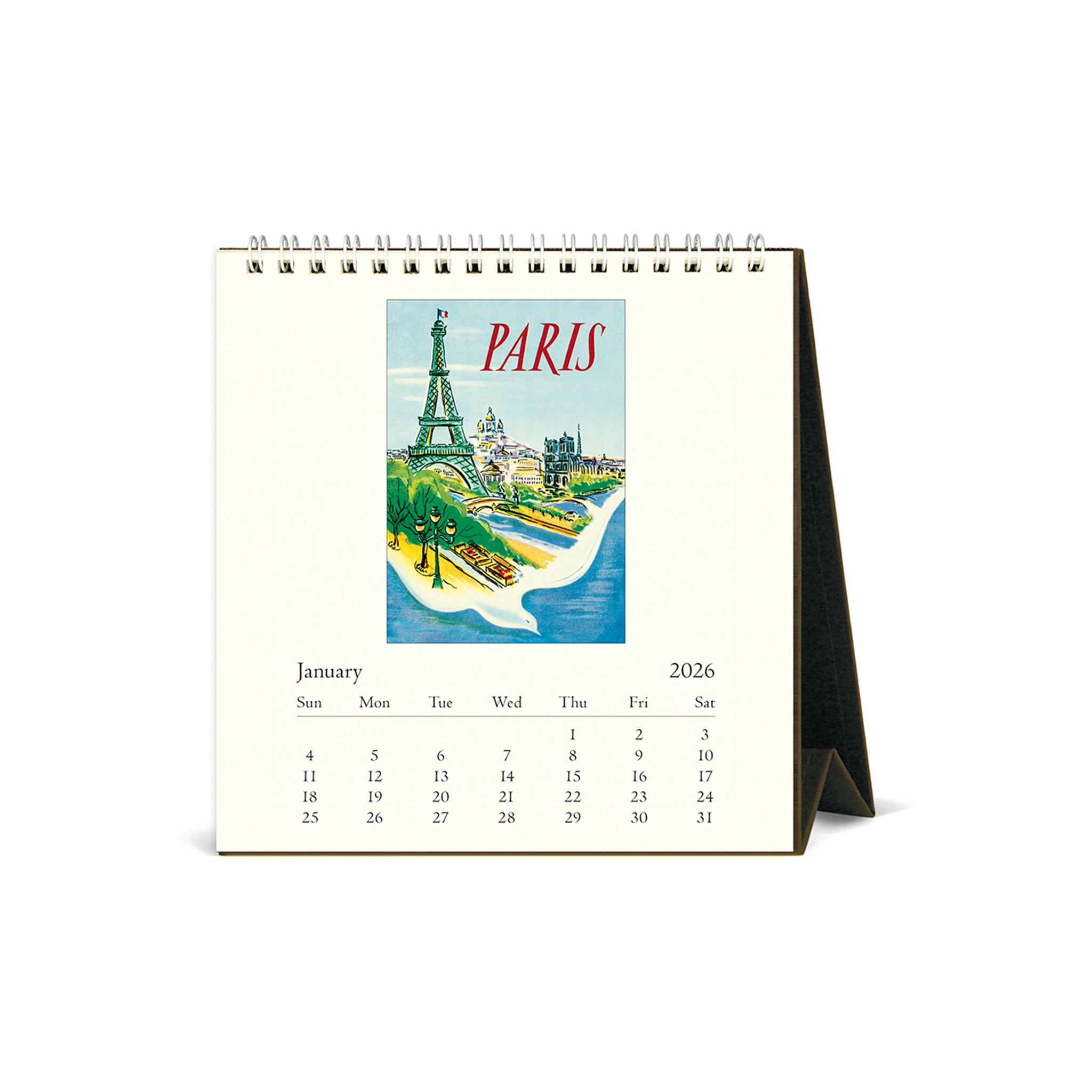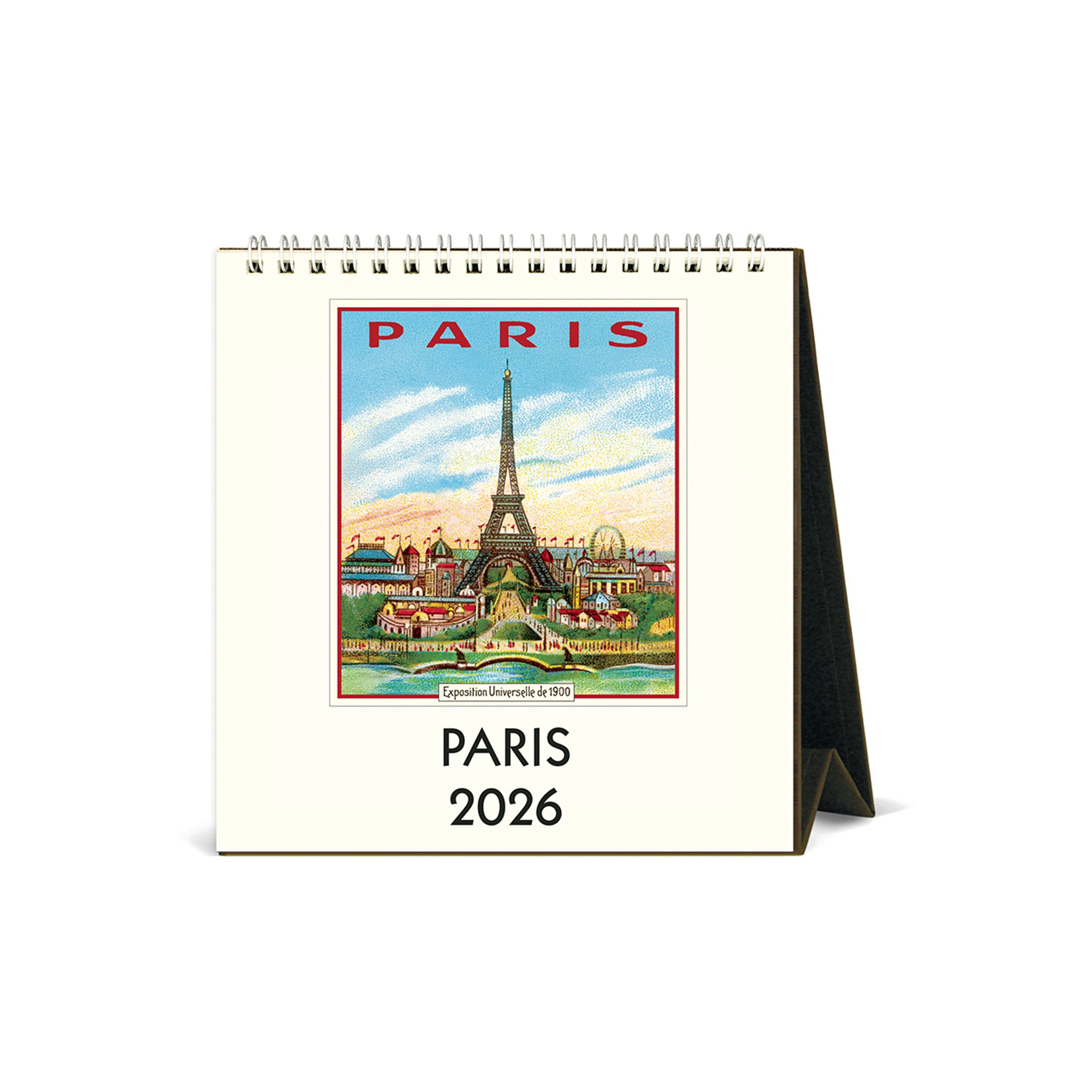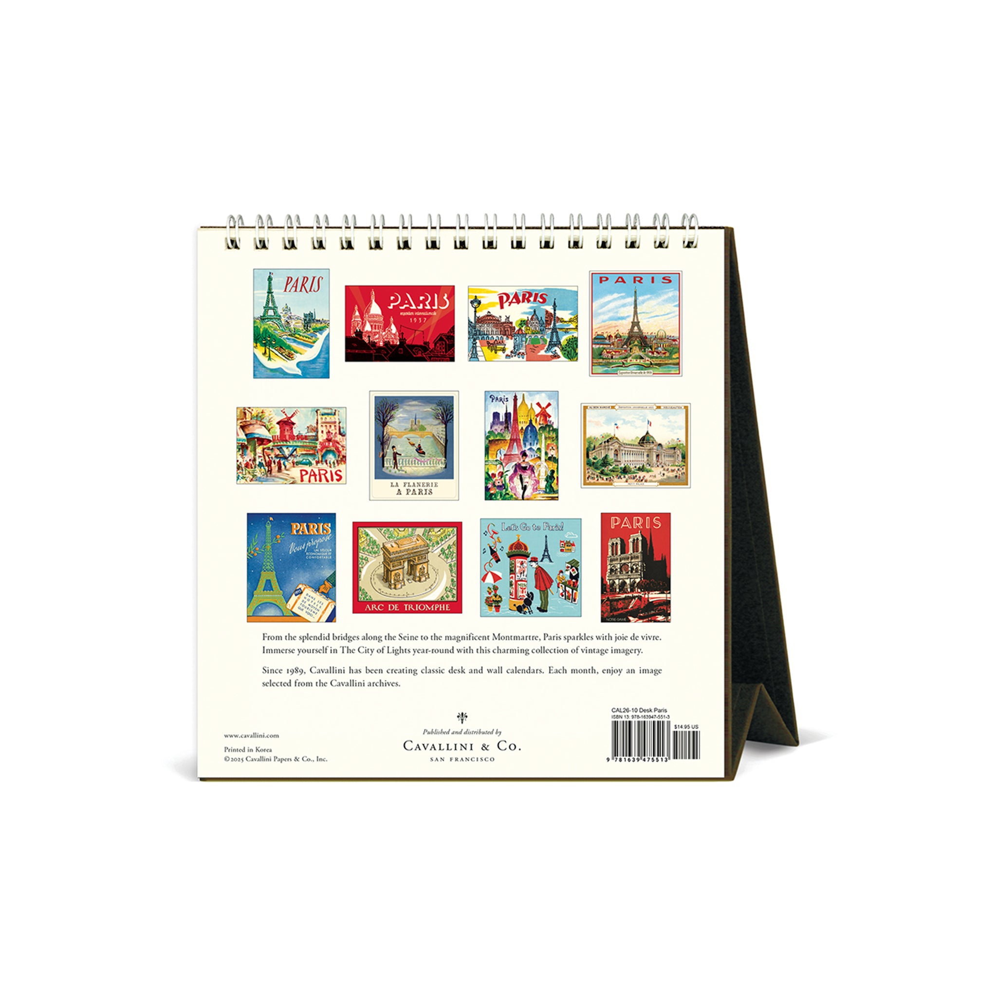 Keep dreams of Paris near with this adorable desk calendar. A perfect small size for any crowded workspace! Featuring archived images of Parisian posters, this spiral desk calendar pops up to sit neatly or fold flat. Calendar measures 6.5 x 6.5 inches