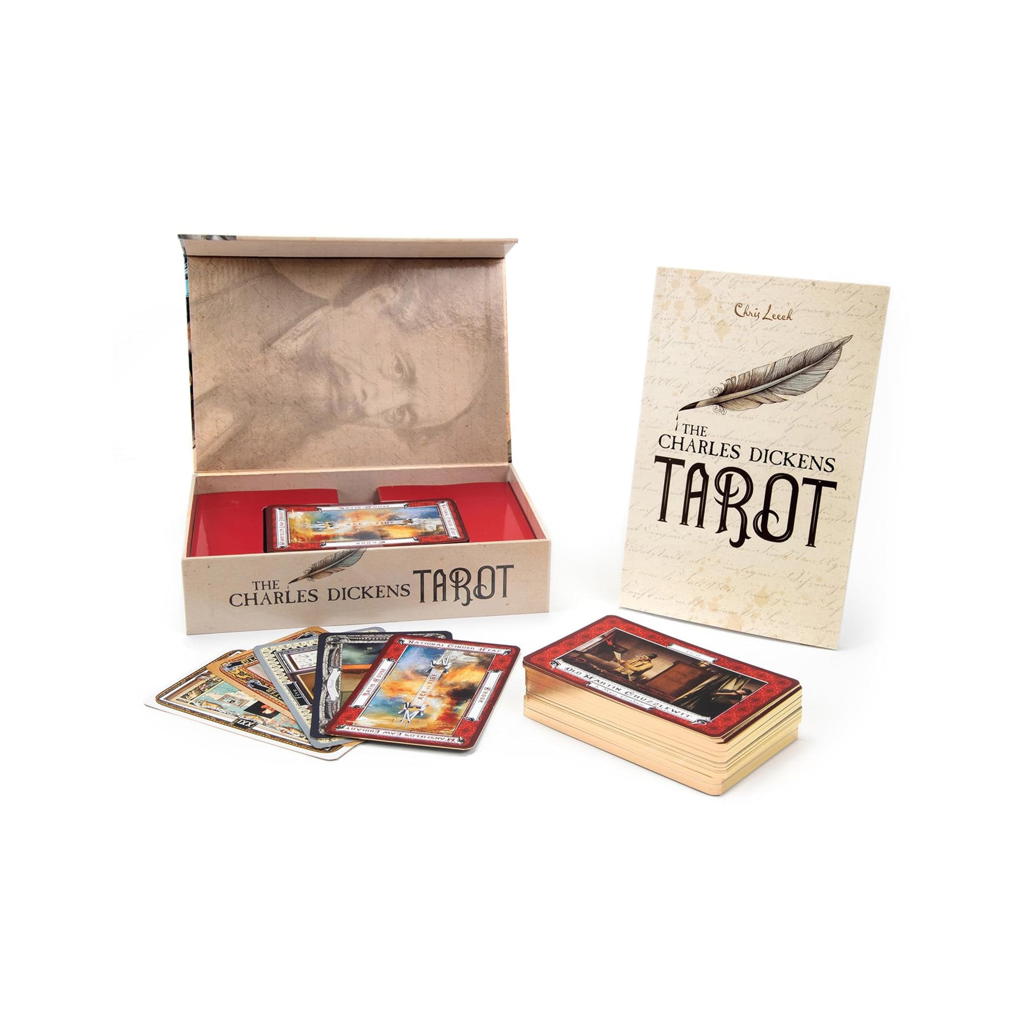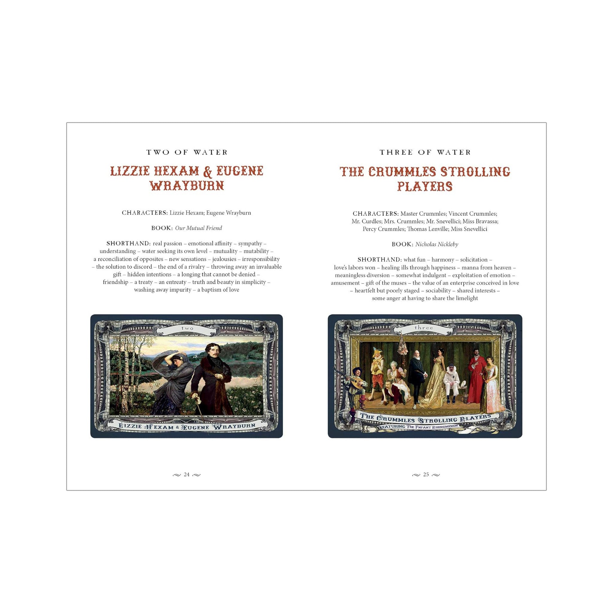 Using art and symbolism from the Dickensian Victorian era, this rich and inspiring 78-card deck and guidebook draws on literary themes but remains rooted in traditional Tarot. The Major Arcana focuses on Dickens’s own life and history, including real-life people who were worked into his fiction. These include his father, John, as Wilkins Micawber in the Emperor card and his mother, Elizabeth, as Mrs. Nickleby in the Empress card. The four suits—Fire, Water, Air, and Earth—are populated by a plethora of his best-loved characters and novels. The horizontal orientation of the cards invokes an open book, a vista, or even a panorama of Dickens’s scenes. The guidebook, written in Dickensian “shorthand,” provides keyword analysis of each card, making the meaning clear in both your own life and in relationship with Dickens’s characters.