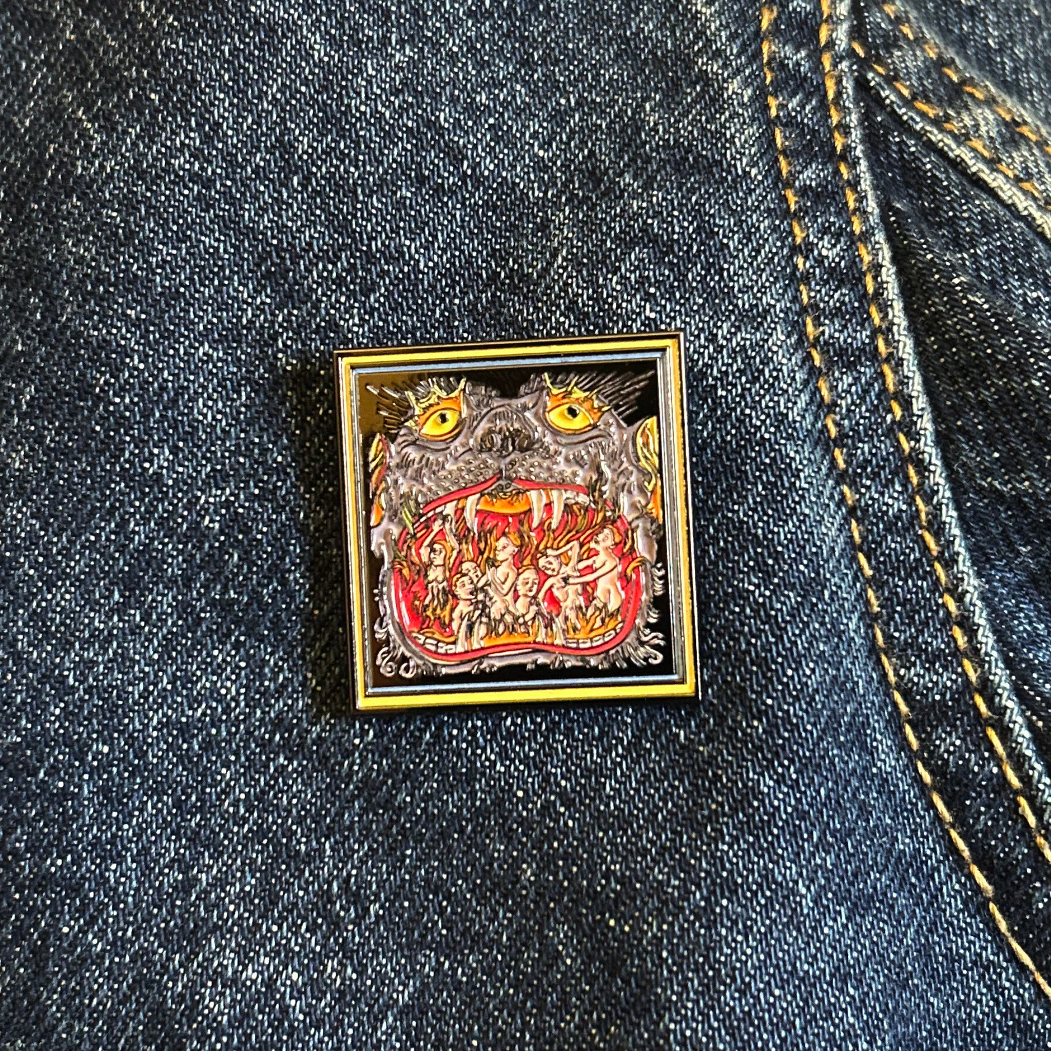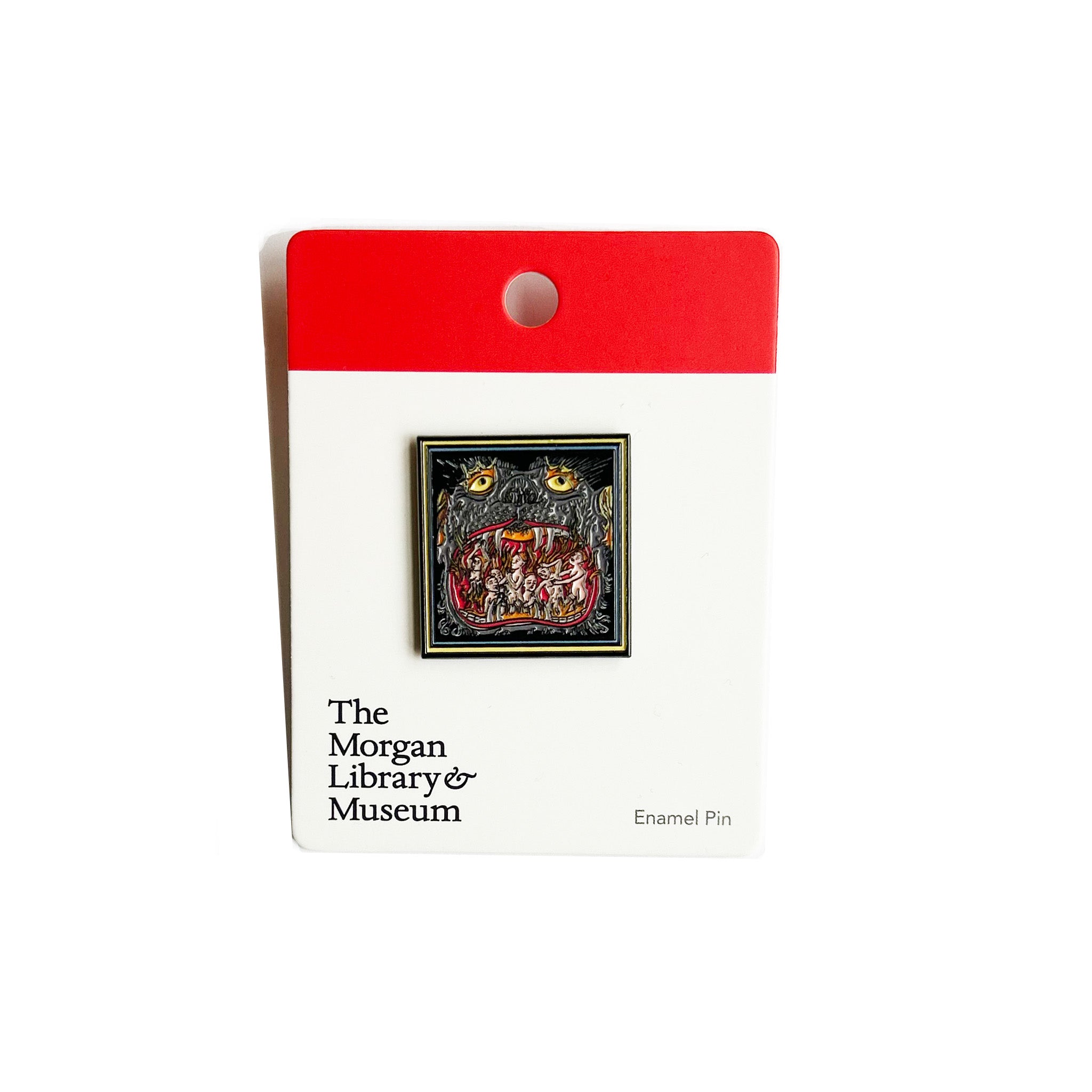 A conversation starter for sure! This enamel pin highlights a popular image from the Morgan's famous manuscript the Hours of Catherine of Cleves. The large demon holds writhing figures in the burning flames of its mouth as these souls wait in the limbo of purgatory.