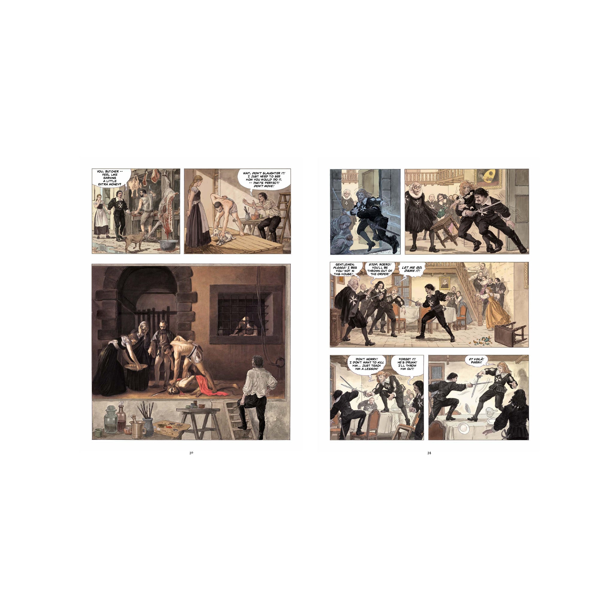 Caravaggio: The Palette and the Sword Book 1 and Caravaggio: The Palette and the Sword Book 2 ― the latter available in English for the first time ― mark the return of Milo Manara to U.S. readers and the debut of a new series of affordable graphic novels from Fantagraphics of maestro Manara’s internationally acclaimed work. This second volume also includes an exquisite portfolio of Caravaggio’s paintings from the 1600s, created during his exile from Rome.