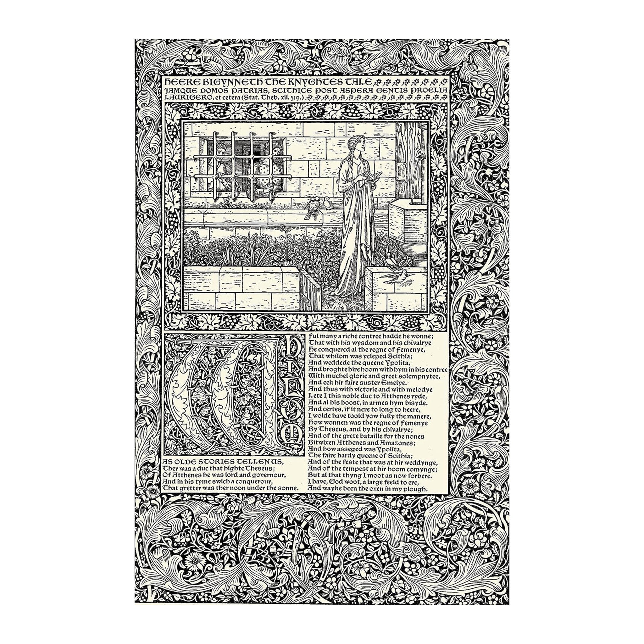 Inspired by the hand presses of the fifteenth century, Morris established the Kelmscott Press to publish books of his own design and to revive the quality achieved by the pioneers of printing. The Works of Geoffrey Chaucer represents Morris's most ambitious undertaking as a printer and designer as well as his swansong; the four-year undertaking was completed just a few months before his death. Morris supervised every detail of production, including the choice of ink and paper, the design of the type, and the use of ornaments and illustration. His lifelong friend, the celebrated painter Edward Burne-Jones, drew 87 magnificent full-page woodcut illustrations. "If we live to finish it," Burne-Jones wrote, "it will be like a pocket cathedral — so full of design and I think Morris the greatest master of ornament in the world."