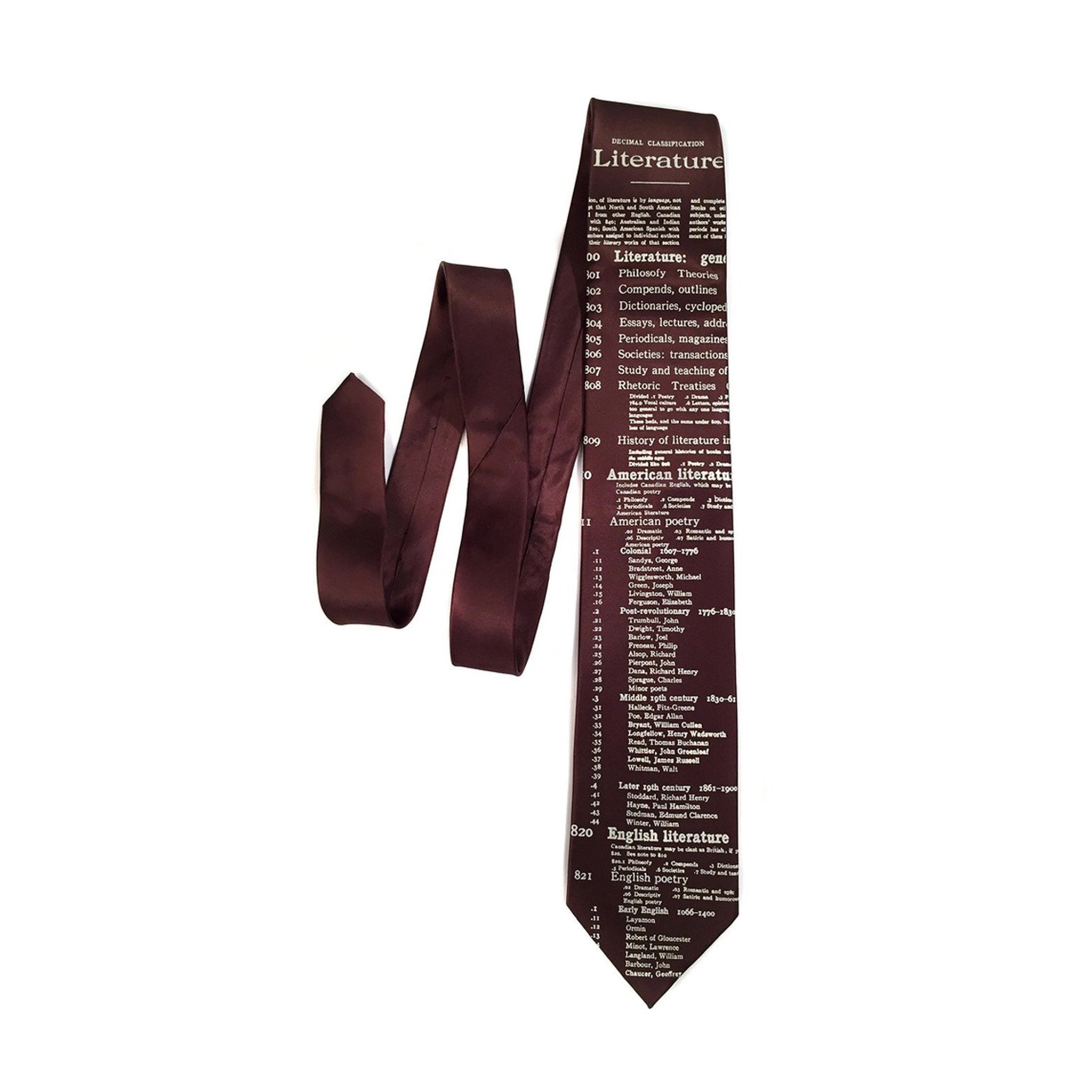 This neck tie features a detail of the Dewey Decimal library classification for Literary works on a beautiful dark brown silk. Delight your favorite librarian, book lover, author, writer or poet with this perfect literary gift!