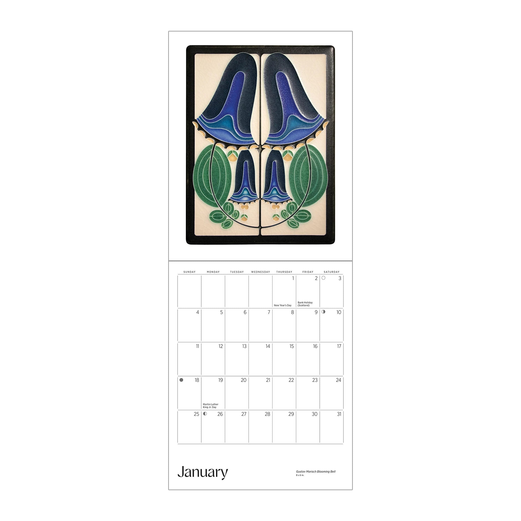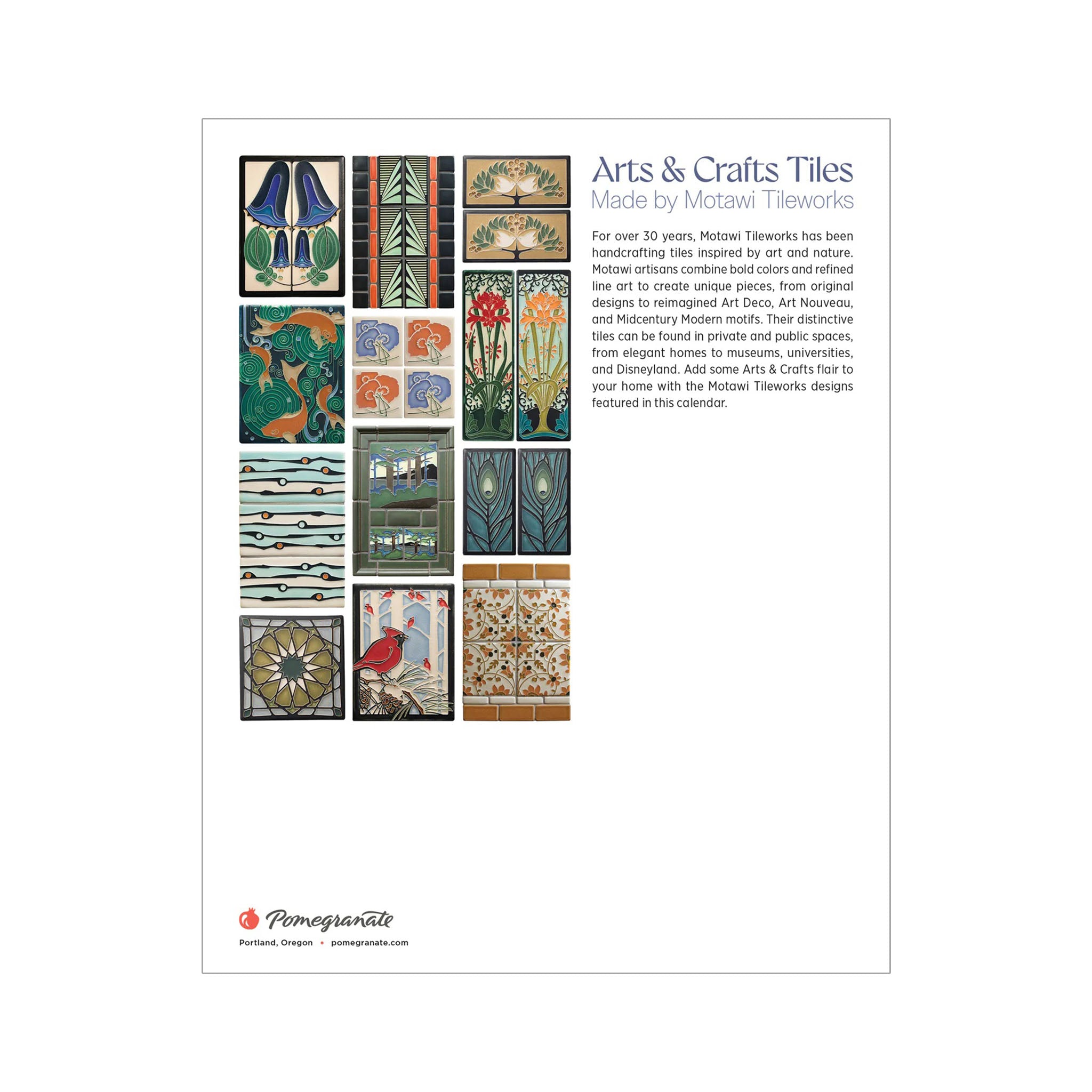 For over 30 years, Motawi Tileworks has been handcrafting tiles inspired by art and nature. Motawi artisans combine bold colors and refined line art to create unique pieces, from original designs to reimagined Art Deco, Art Nouveau, and Midcentury Modern motifs. Their distinctive tiles can be found in private and public spaces, from elegant homes to museums, universities, and Disneyland. Add some Arts & Crafts flair to your home with the Motawi Tileworks designs featured in this calendar.