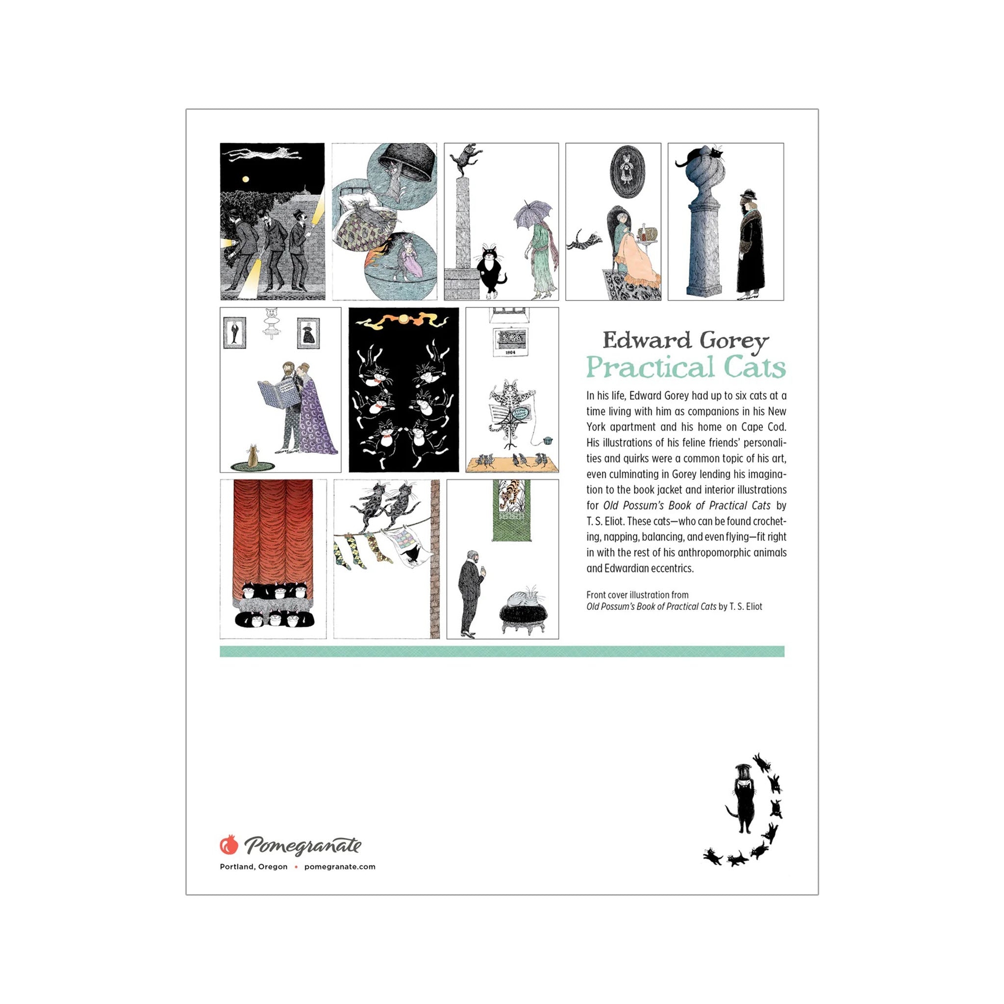 In his life, Edward Gorey had up to six cats at a time living with him as companions in his New York apartment and his home on Cape Cod. His illustrations of his feline friends’ personalities and quirks were a common topic of his art, even culminating in Gorey lending his imagination to the book jacket and interior illustrations for Old Possum’s Book of Practical Cats by T. S. Eliot. These cats—who can be found knitting, napping, balancing, and even flying—fit right in with the rest of his anthropomorphic animals and Edwardian eccentrics.