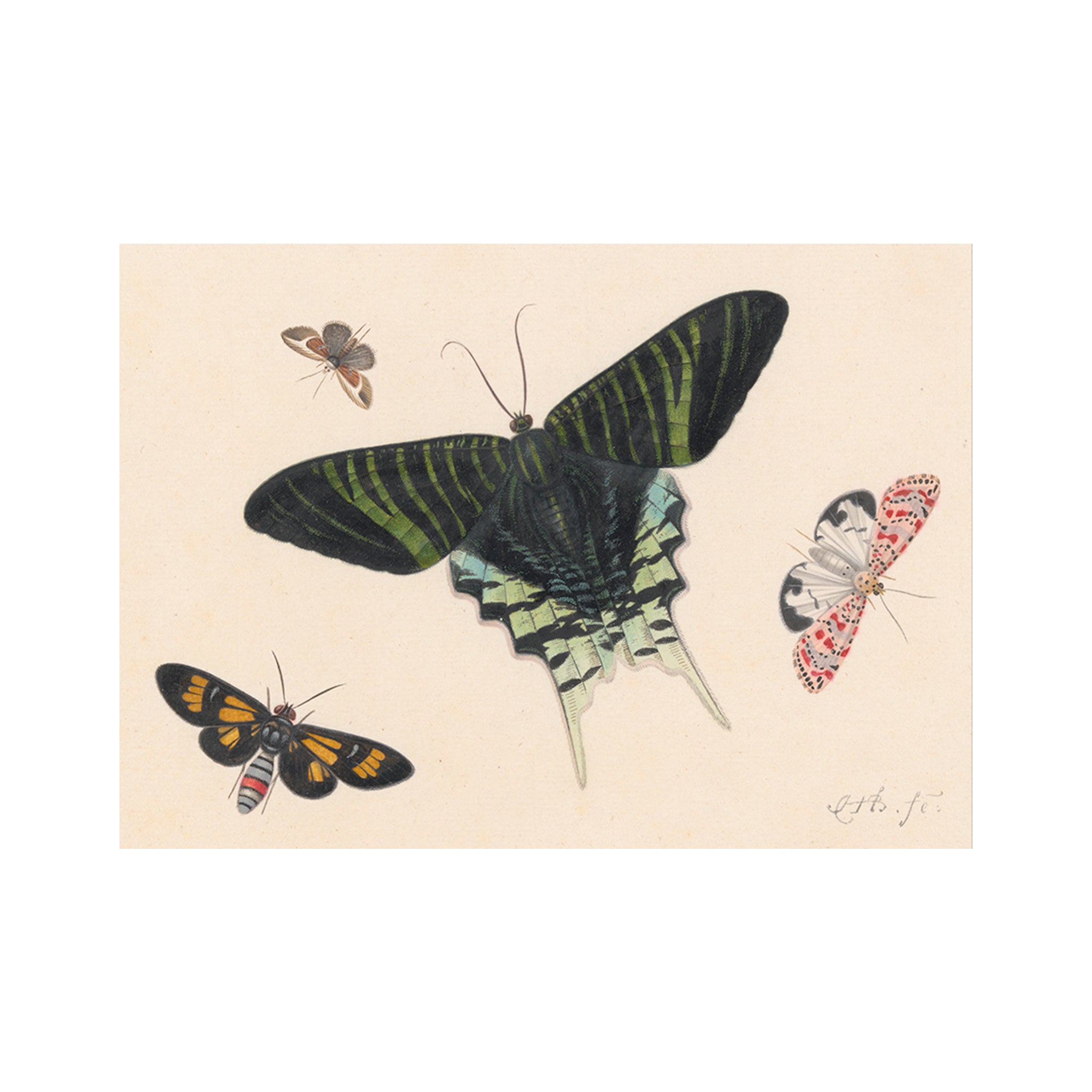 One of two sheets by Hestenburgh from the Moore collection, is beautifully reproduced in this set of eight notecards with envelopes. Four Moths, Including a Green-Banded Urania (Urania leilus). The artist, informed by oil painting techniques, built up delicate layers of watercolor over black chalk to delineate whisper-soft textures, subtle colors, and patterns indicative of insect wings.