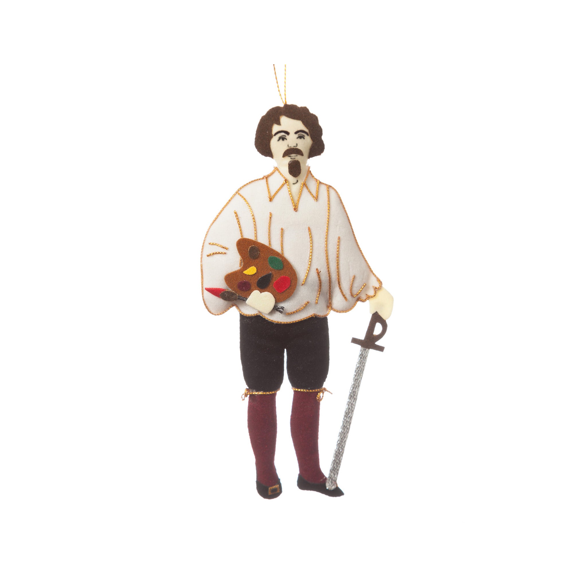 Michelangelo Merisi da Caravaggio, known more famously as Caravaggio, was an Italian artist of the Baroque era that brought to Rome a tradition of naturalism that stretched back to Leonardo da Vinci's work in Milan. His realistic observation of humanity and dramatic painting techniques had a formative influence on art of the time and throughout generations to come. The ornament depicts the artist in casual garb cradling a painter's palette as well as grasping a sword in his other hand, reminding us of his turbulent life. Makes and excellent gift or holiday ornament.