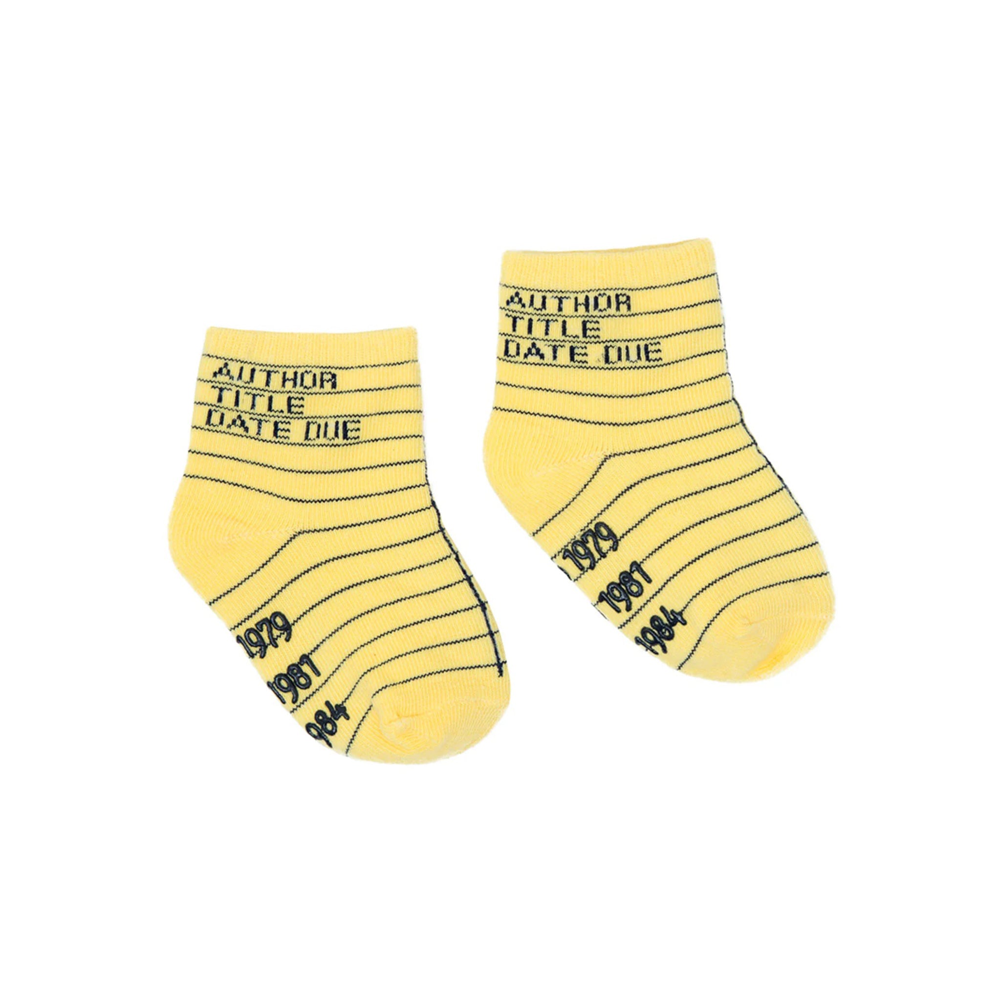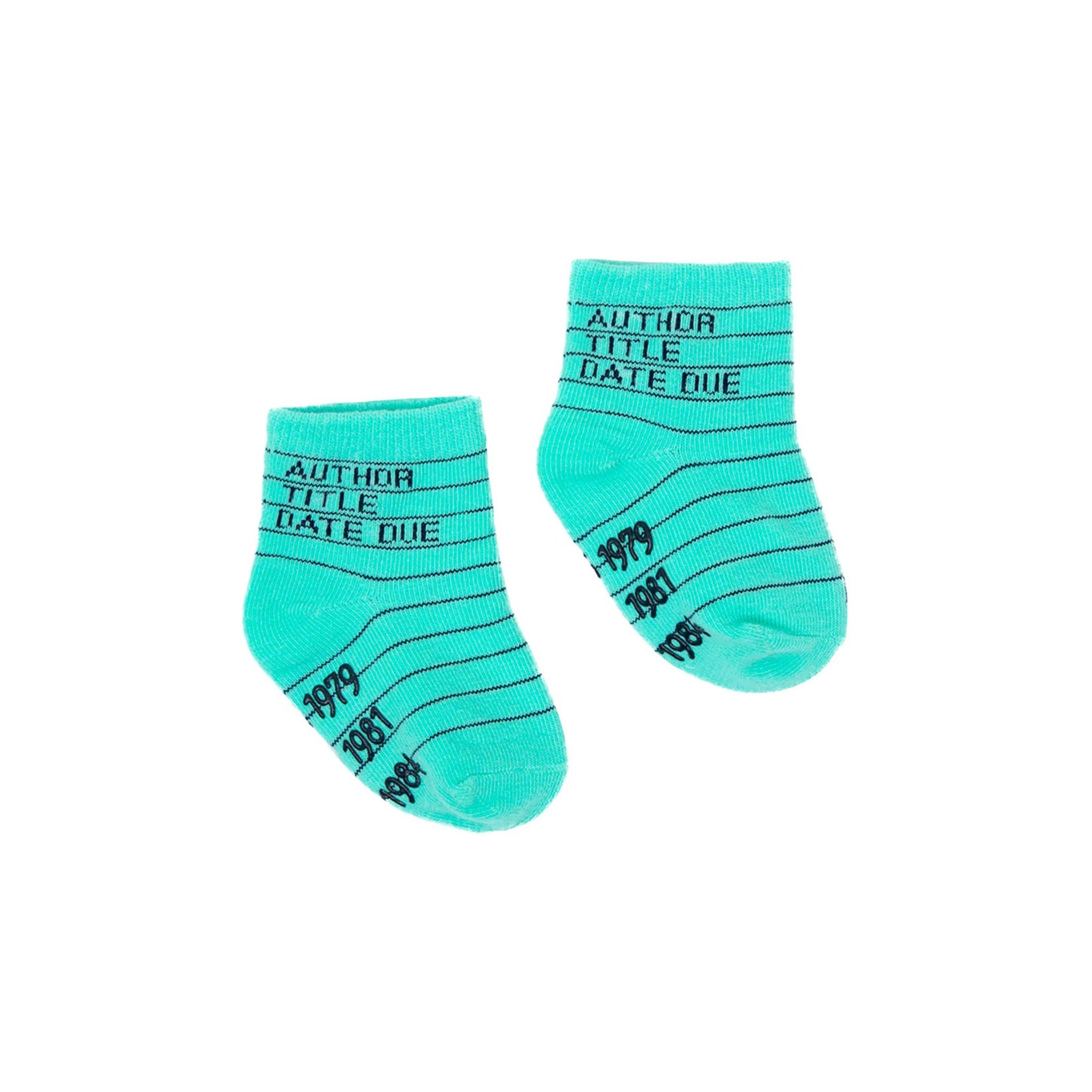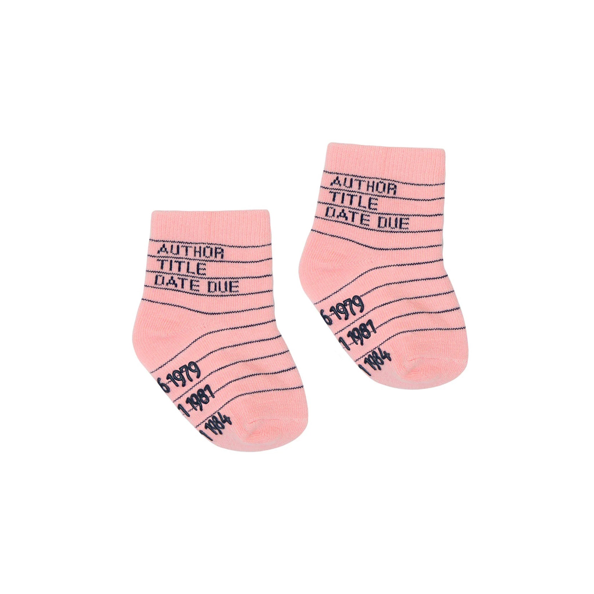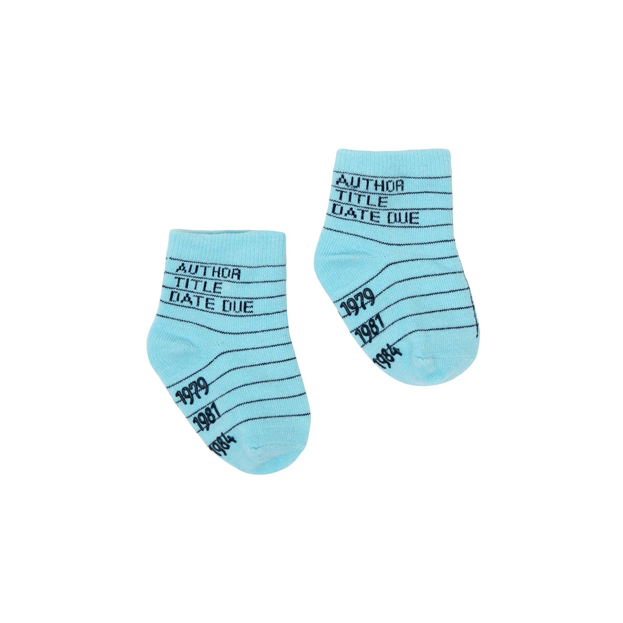 Your are past due to make your child the cutest in the kid's section of the library with these adorable socks! This pack of 4 socks are designed with a traditional library card, one pair each in light blue, mint green, pink, and yellow with non-skid soles.