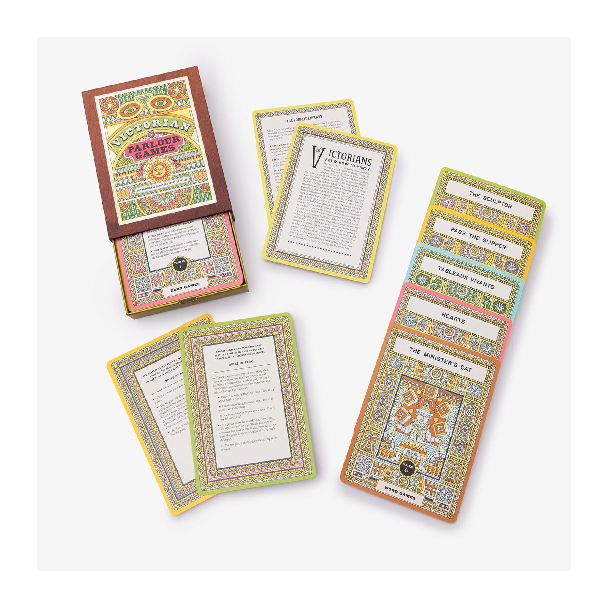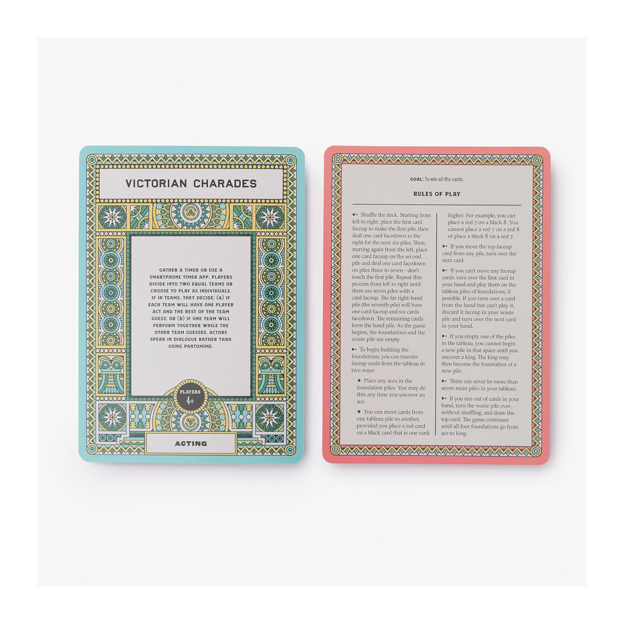 Deal yourself in for a good time as you choose from a selection of games enjoyed in many a Victorian parlour. The box comes with rules to fifty games that can be played without any extra frippery, except perhaps a deck of cards if you fancy a game of Whist. Each game is good for two or more players, with most designed for a group to play together. Card games and guessing games, pantomime and word play—all provide an after-dinner evening of fun, or an afternoon of amusement on the couch or around a picnic table. These games are simple to learn, quick to play, and have silly penalties for when a player is “out.” One side of each card provides the category, the number of players, and the setup for the game while the other has the rules so you can keep them handy as you play.