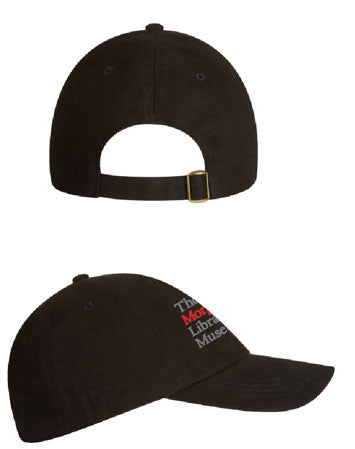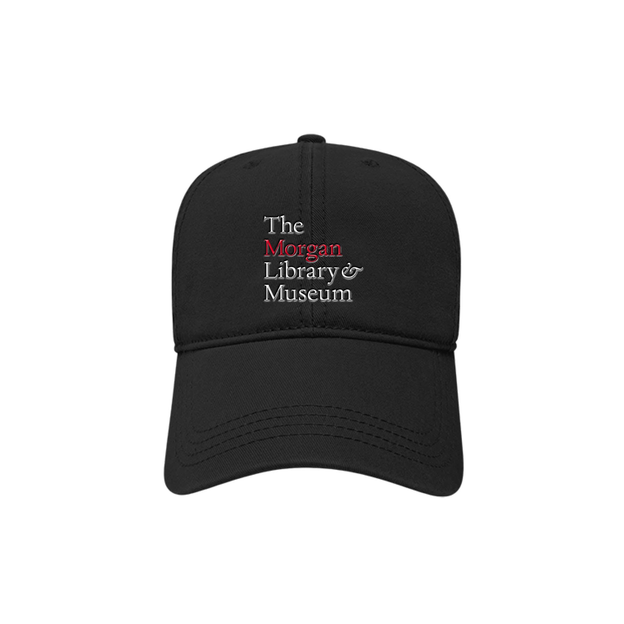A classic addition to any casual outfit, the Morgan Library & Museum Baseball Cap shows superfan support! This black cotton hat features an embroidered logo of the museum in red and white. The washed chino twill cap has a fabric closure with and antique brass sliding buckle to adjust the fit.