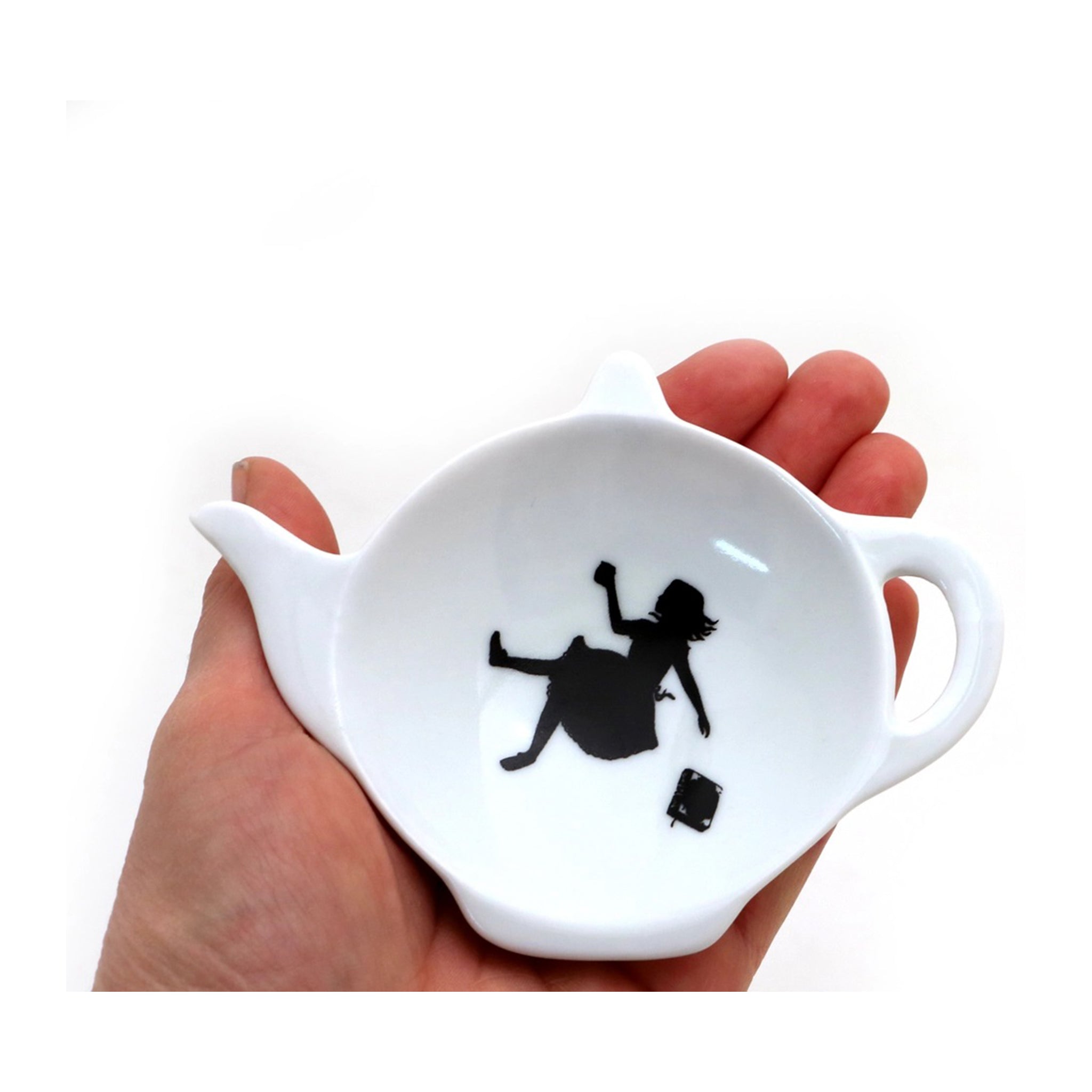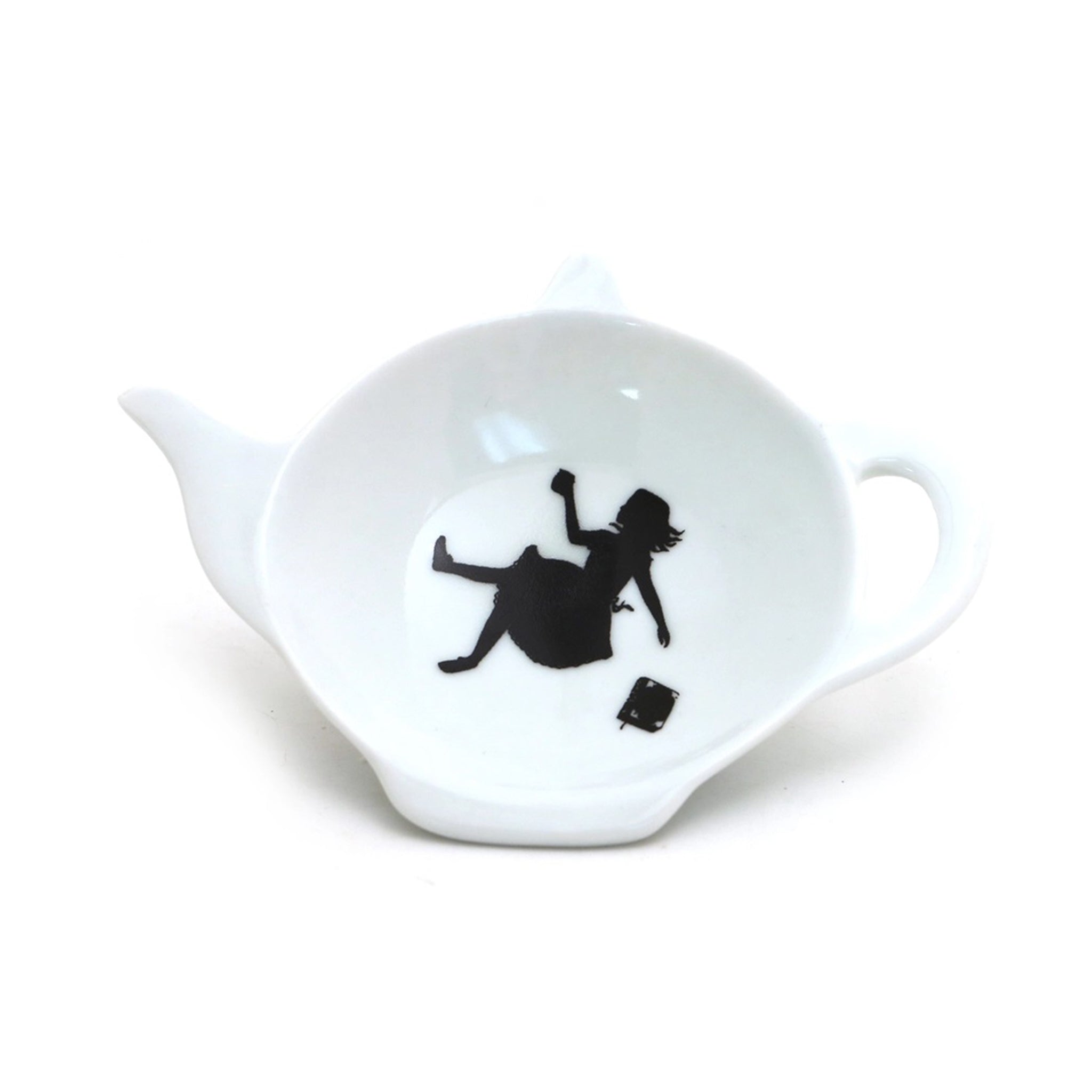 So fun! This teapot-shaped tea bag holder features a silhouette of Alice and her book tumbling through the looking glass.