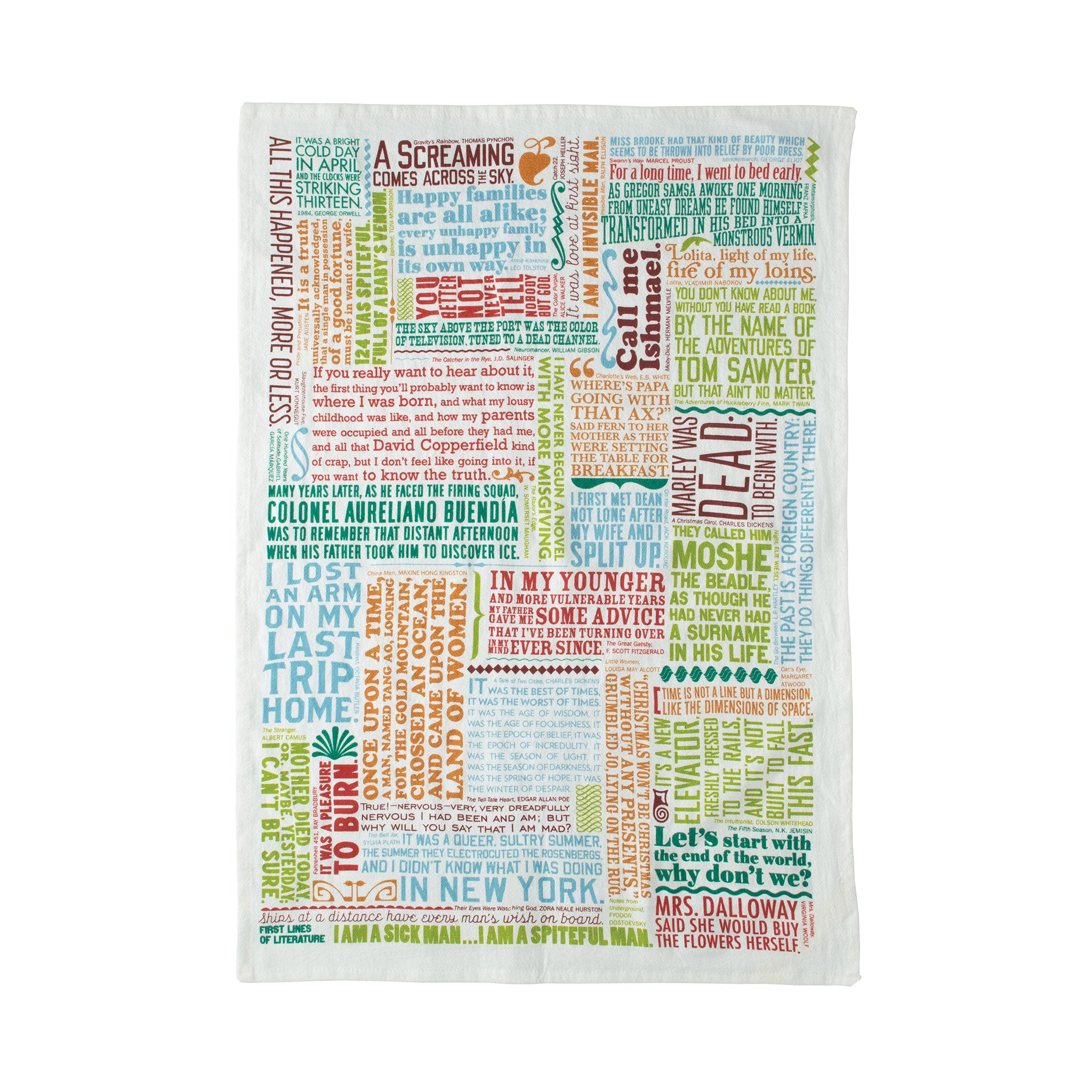 Here's the First Lines of Literature Tea Towel, with the opening lines from 39 different pot-boilers and fish stories and Most Illustrious Literary Voices.
