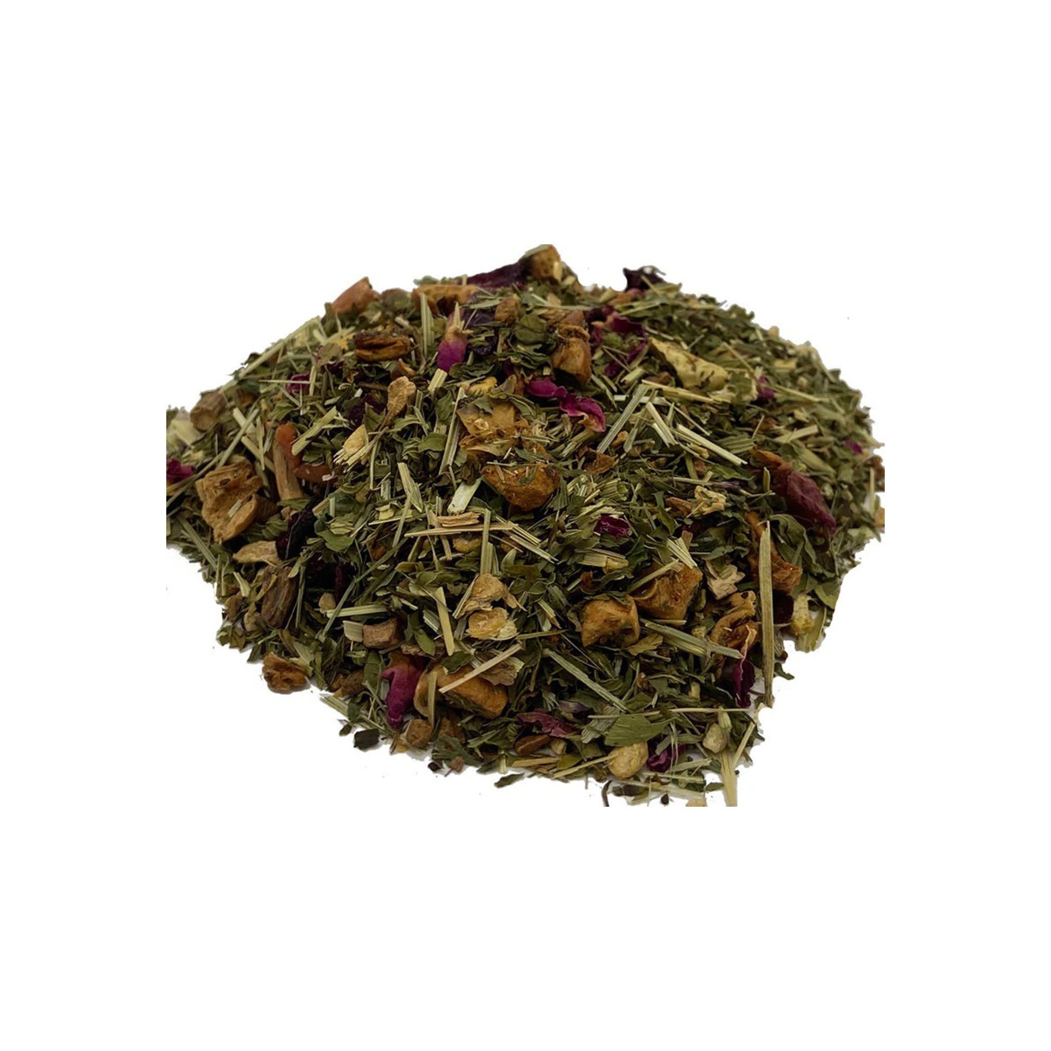 Imagine sitting at Walden Pond enjoying a quiet, peaceful moment with a cup of this caffeine free tea. The vibrant herbal blend has a fresh garden aroma that brews to a delightful red color. The cup imparts a mint and rose floral aroma and a taste that is slightly tart with earthy undertones and notes of rose and oats.