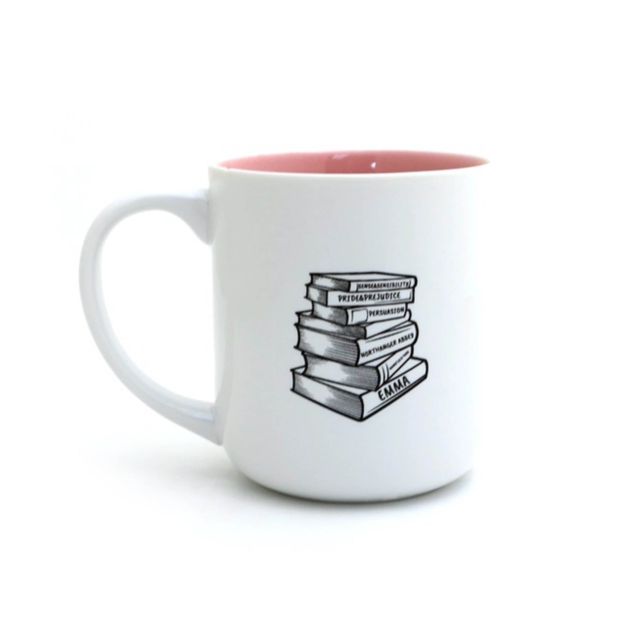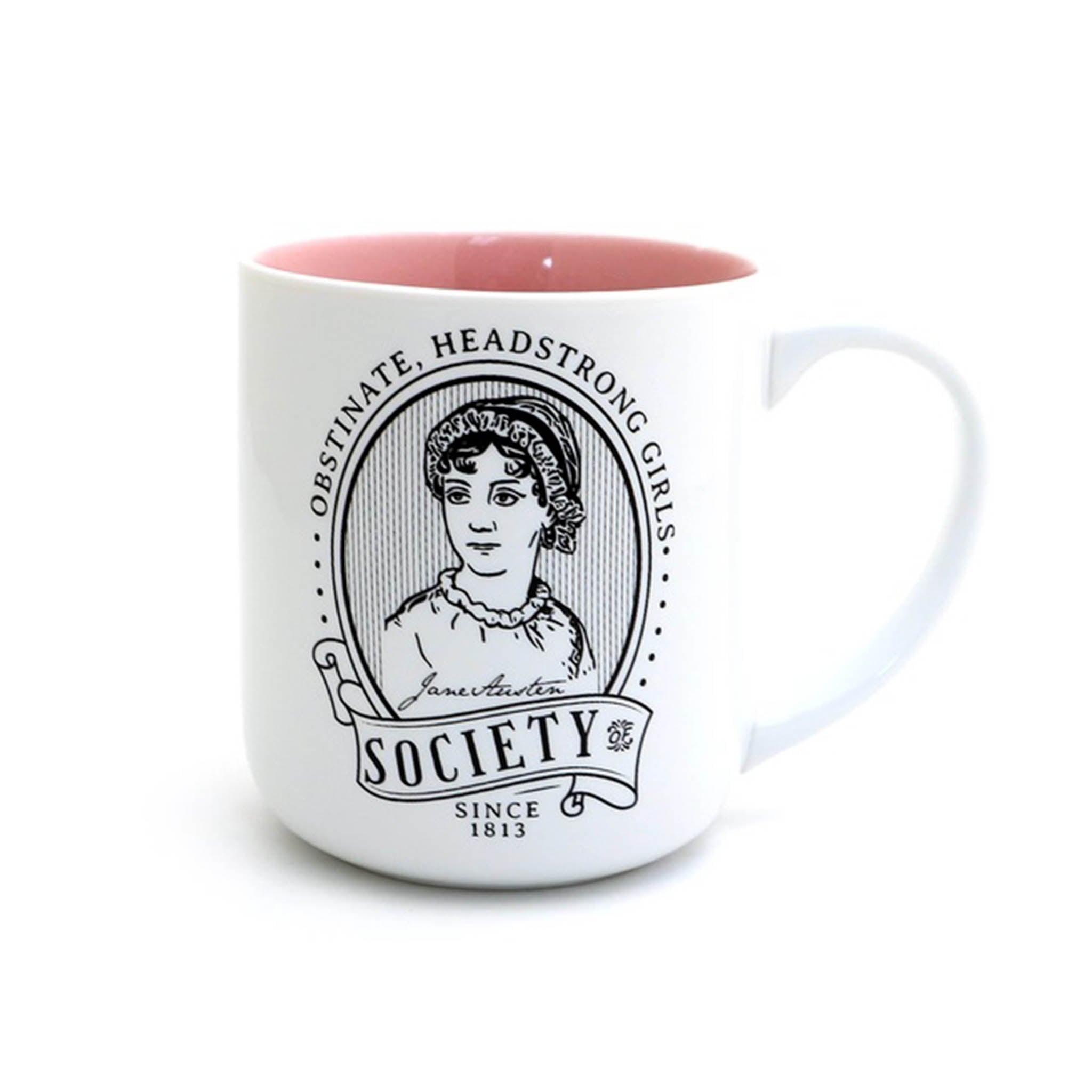 You'll have all pride and no prejudice with this literary mug, an homage to author Jane Austen. This mug reads "Obstinate, Headstrong Girls Society Since 1813." It features a drawing of Jane herself with a stack of her books on the back.