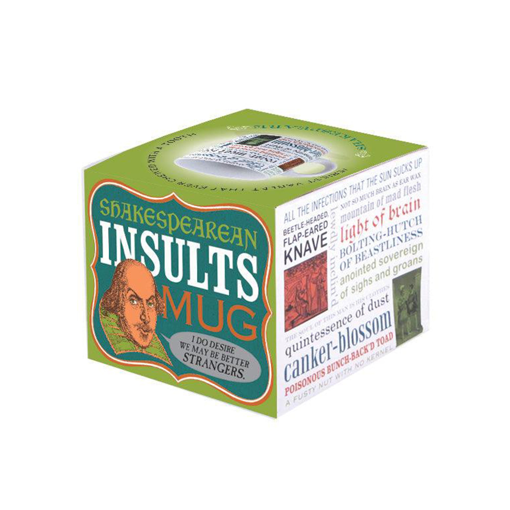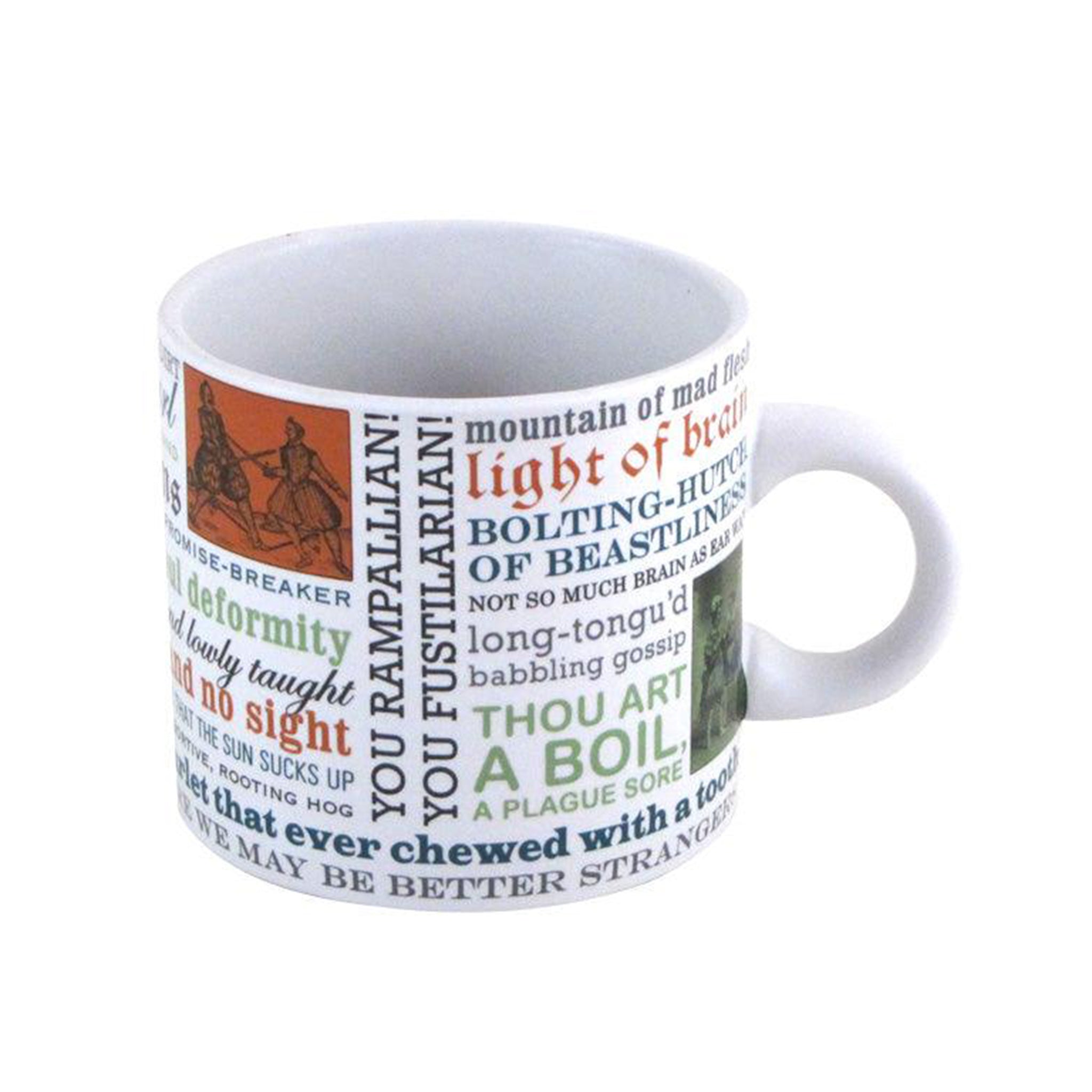 The Shakespearean Insults Mug is covered with the Bard's funniest and most biting insults from his plays. Some of our favorites are: "Oh gull, O dolt, As ignorant as dirt" "lump of foul deformity" "Thou art a boil, a plague sore" and the puzzling "Elvish-mark'd abortive, rooting hog." All in all, there are 30 Shakespearian insults on the mug. So don't be "light of brain" or a "beetle-headed flap-ear'd knave" - Get one today!