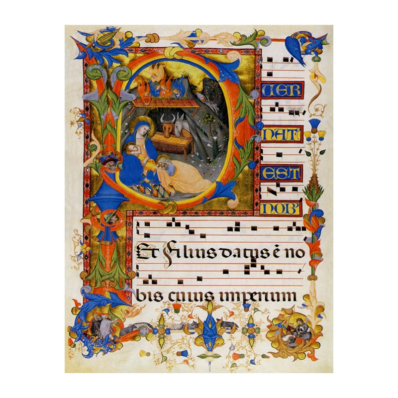 The gradual introit (opening hymn) for Christmas Day begins Puer natus est, “for unto us a child is born.” Illuminators made the most of this graphic opportunity by painting a nativity scene inside the initial P, a space large enough to include iconographic details such as the manger, ox and ass, angels, and the shepherd. Gradual manuscripts could be enormous multivolume compilations two or three feet high, with text and music for the Mass easily legible by the choir standing before a church’s lectern. Here, that broad expanse of parchment left room for the artist to portray the Annunciation to the Shepherds at the foot of the page and Isaiah’s head in the stem of the initial- a reminder that his Old Testament prophecies are the origin of the introit (Isaiah 9:6).
