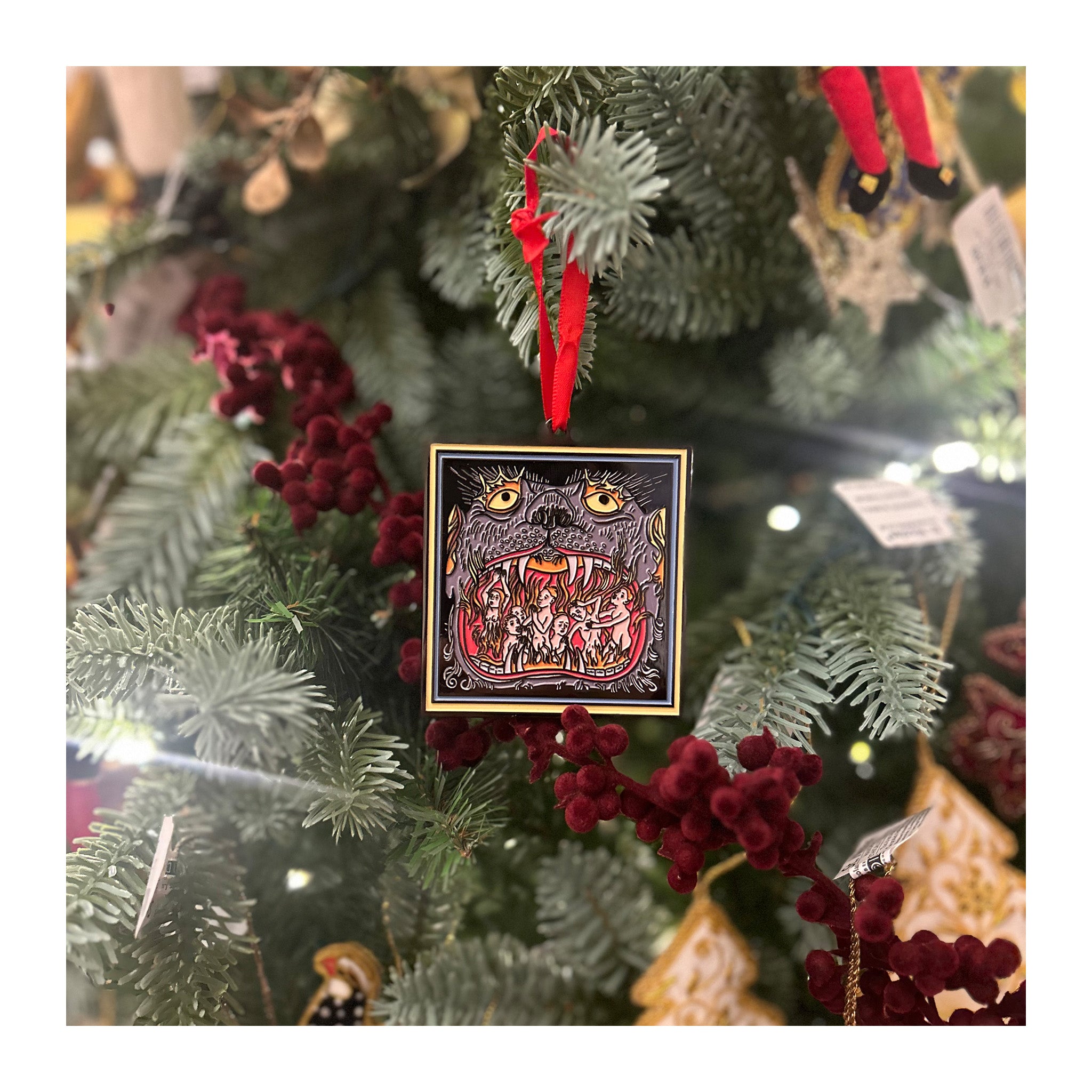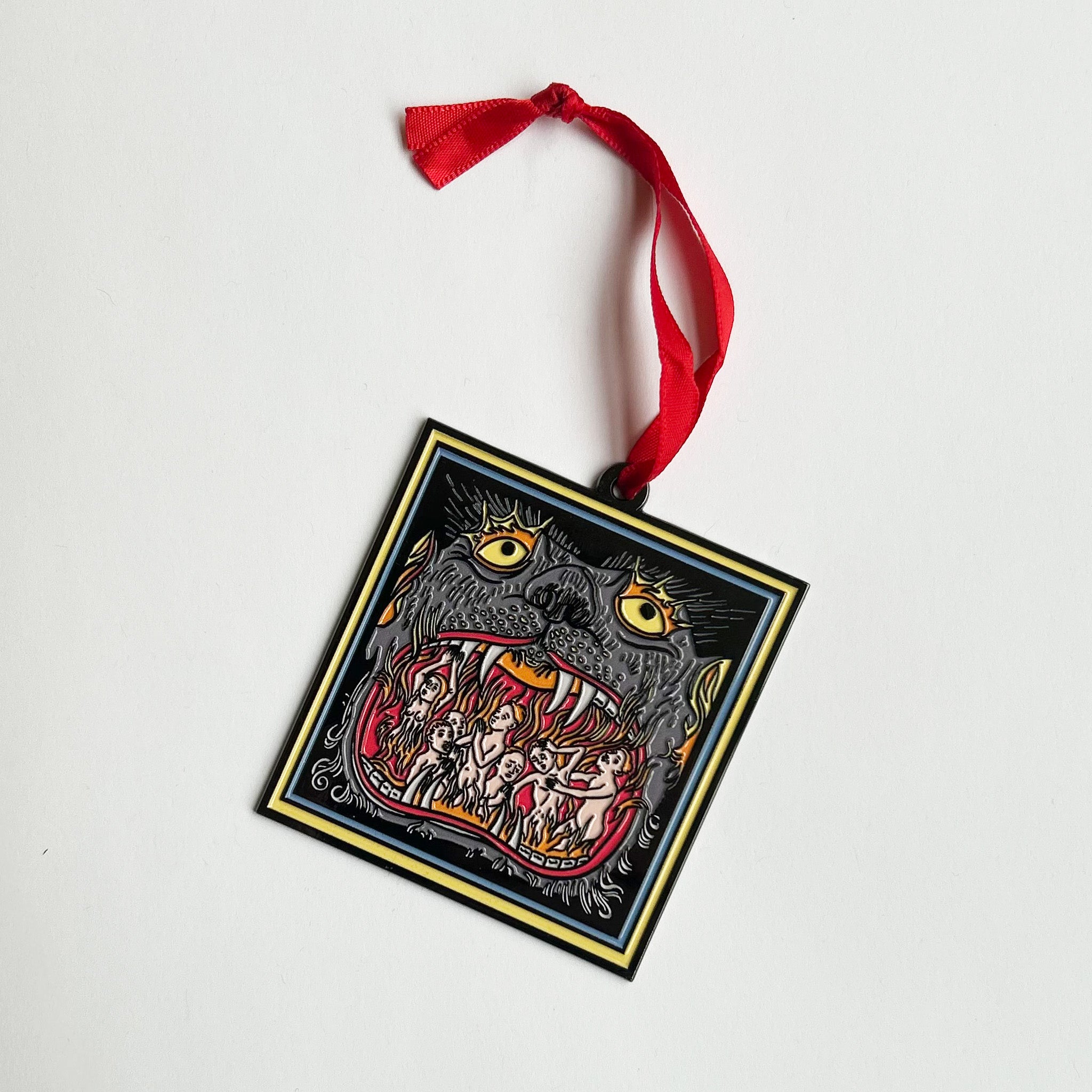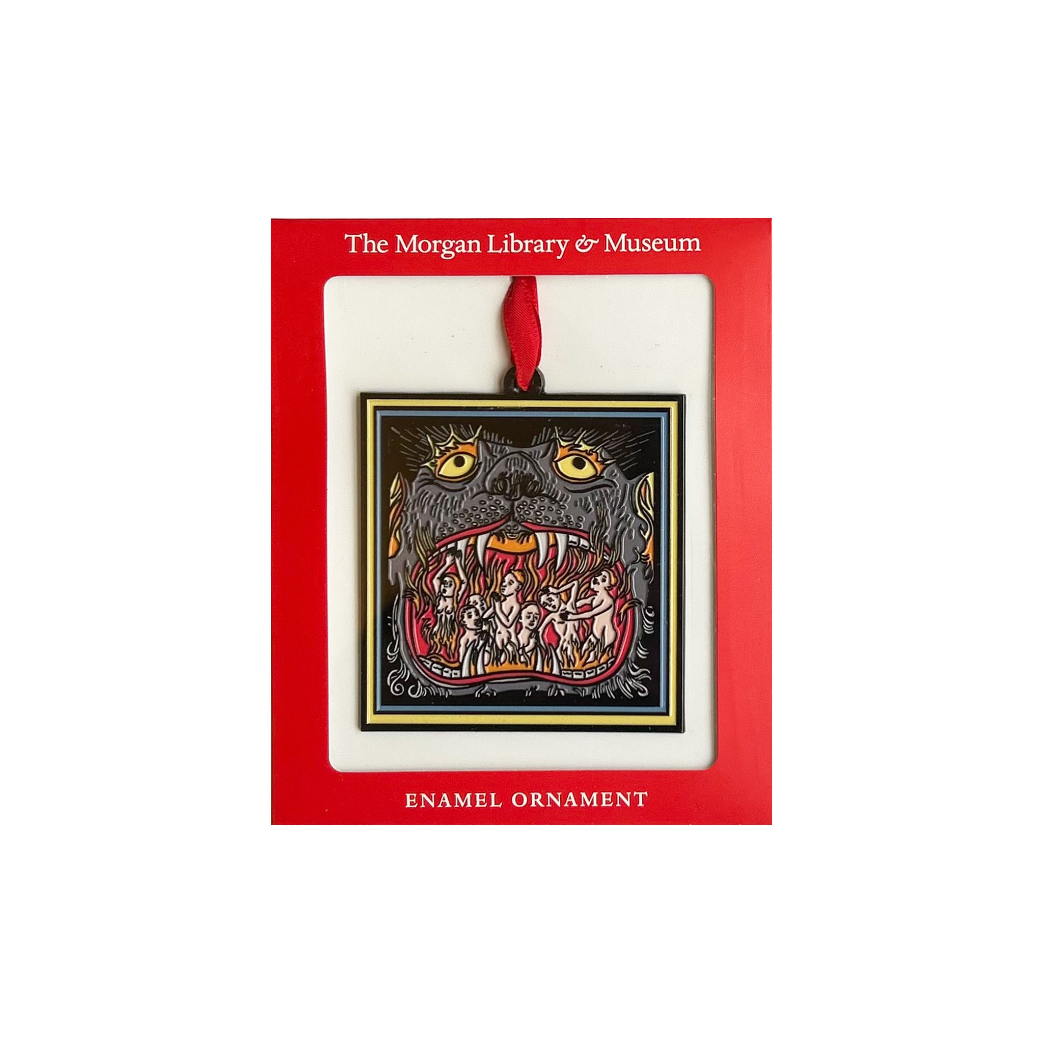 A conversation starter for sure! This enamel ornament highlights a popular image from the Morgan's famous manuscript the Hours of Catherine of Cleves. The large demon holds writhing figures in the burning flames of its mouth as these souls wait in the limbo of purgatory.