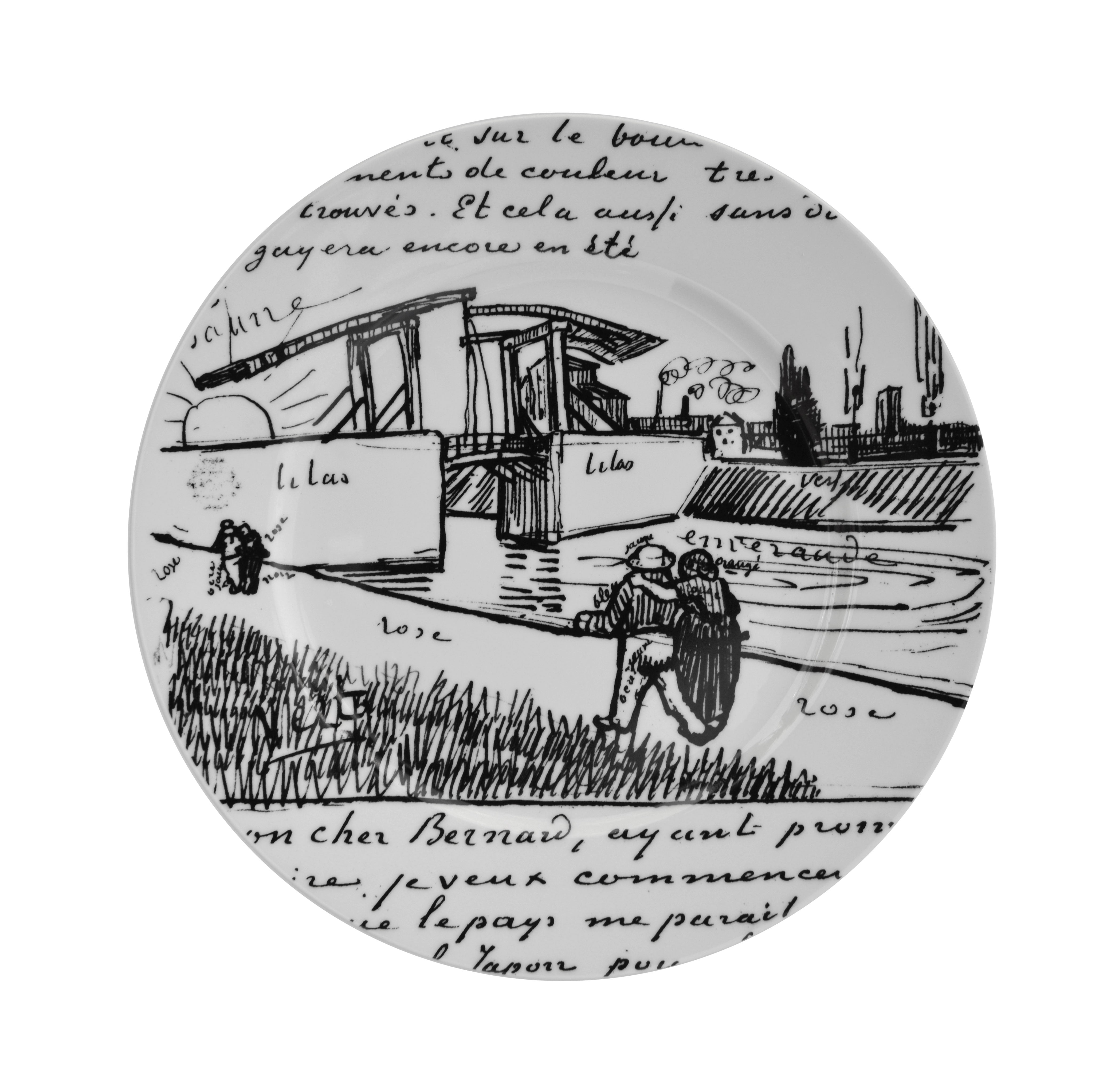 This decorative plate depicts a lovely sketch of the Langlois drawbridge with a walking couple from one of a group of 22 surviving letters from Vincent Van Gogh (1853-1890) to Émile Bernard (1868-1941) from December 1887-November 1889, 19 of which are in the Morgan's collection.