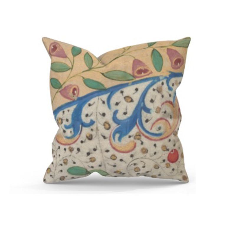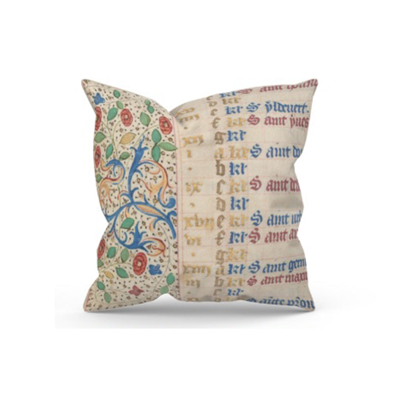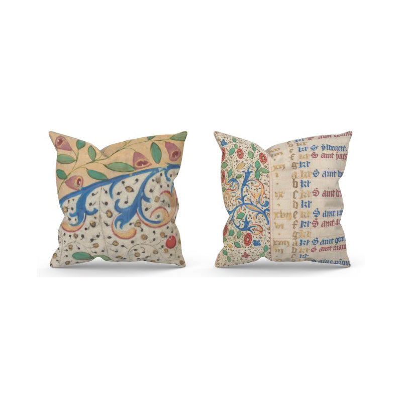 A beautiful floral manuscript border on a pillow is the home decor item you never knew you needed! This colorful canvas pillow features details from two pages in a Book of Hours in the Morgan Library & Museum’s collection. The pillow is double-sided featuring the two differing details from the manuscript.