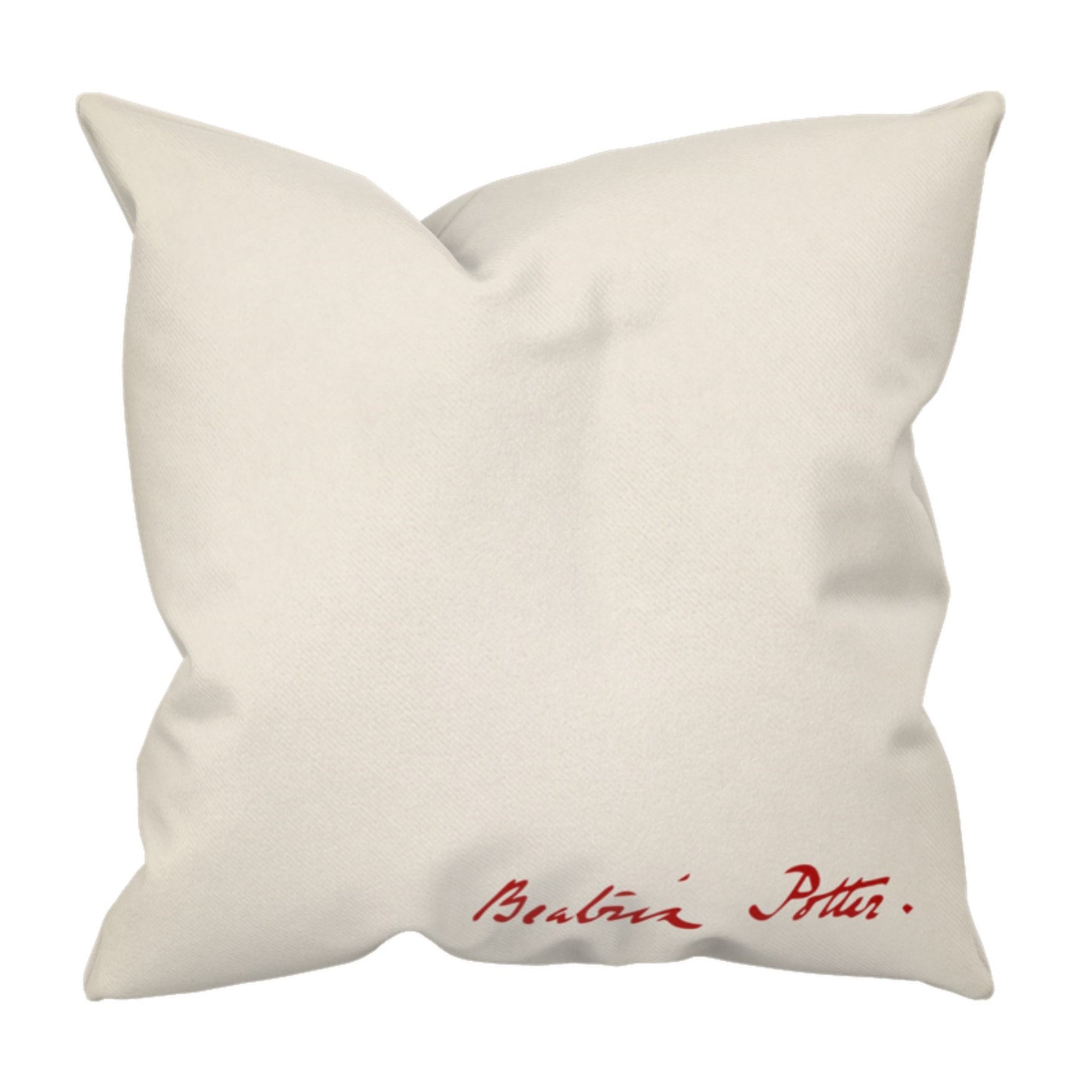 Cute and cozy all winter long! This pillow features an illustration by Beatrix Potter in one of her letters sent to a child. The drawing reproduced in a lovely red on this pillow is complemented with her signature on the back. Canvas pillow comes with a poly fill insert.