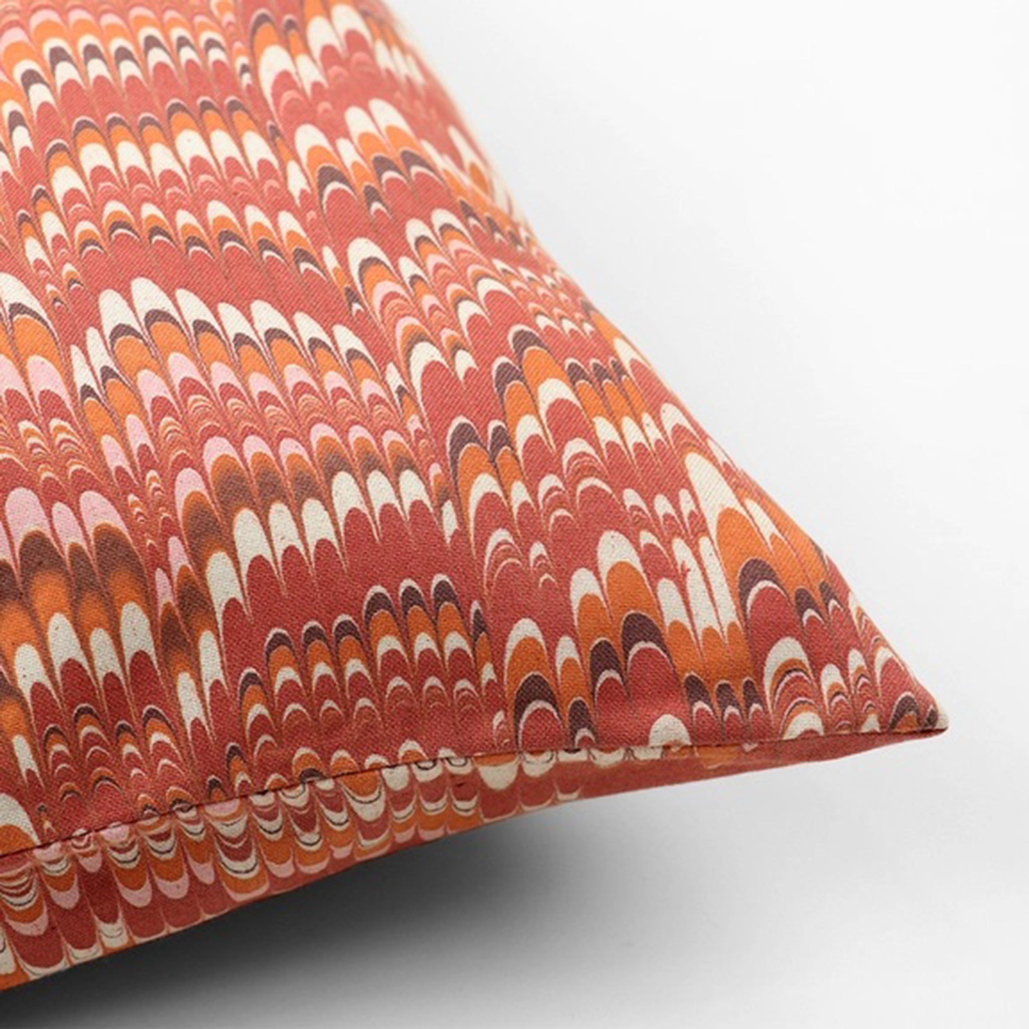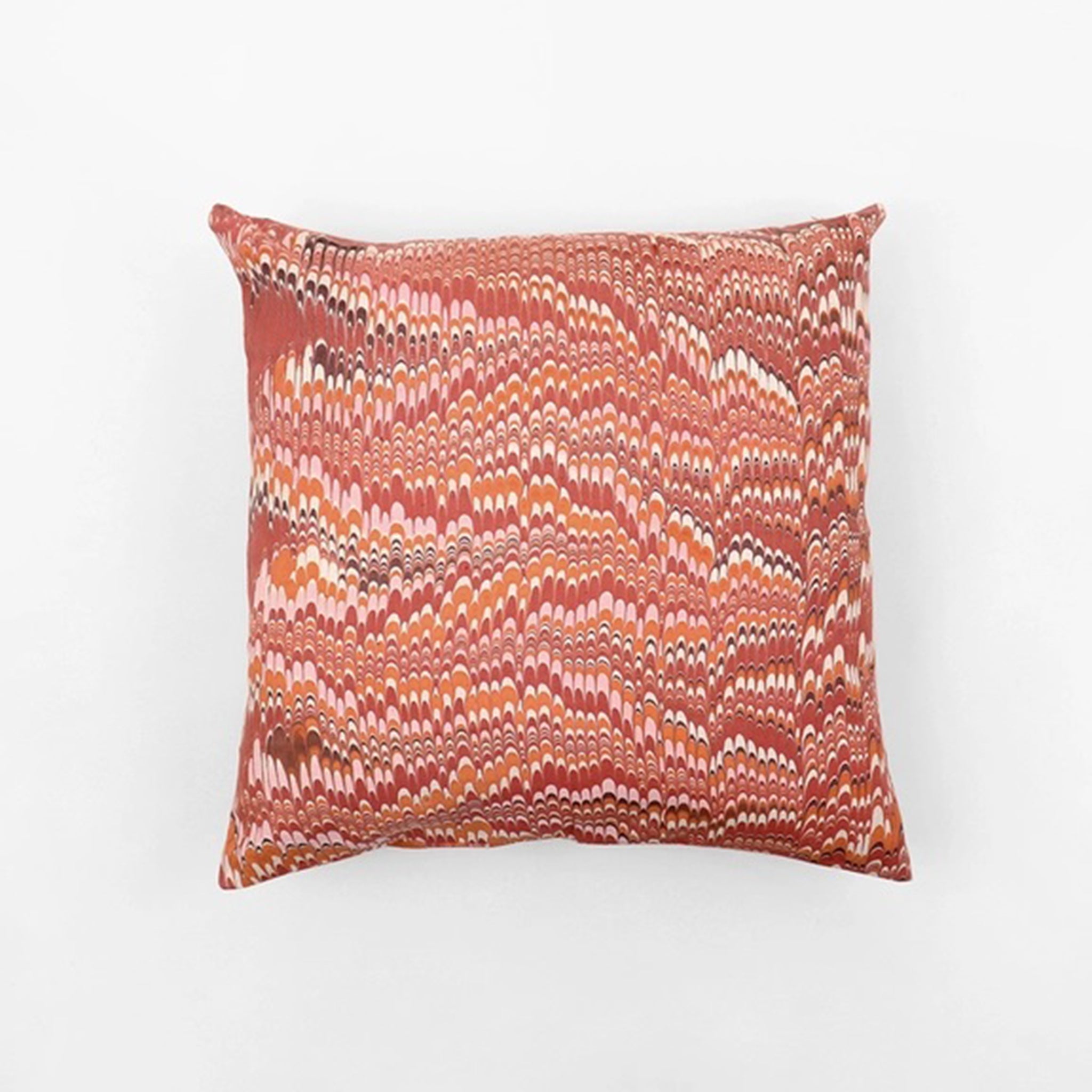 This hand-marbled cushion is inspired by patterns on water, sky and mountains. Made in small batches by master artisans in India, this pillow has a 100% cotton cover with a concealed zipper closure.