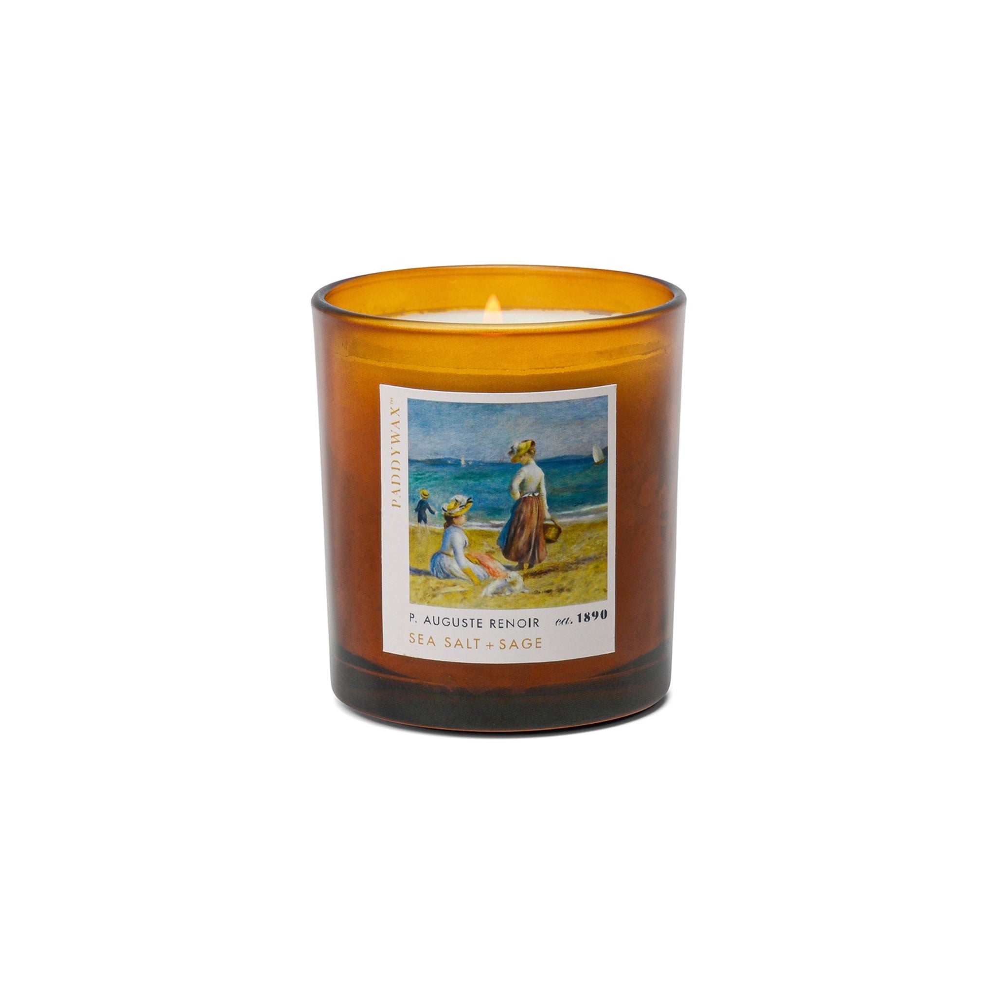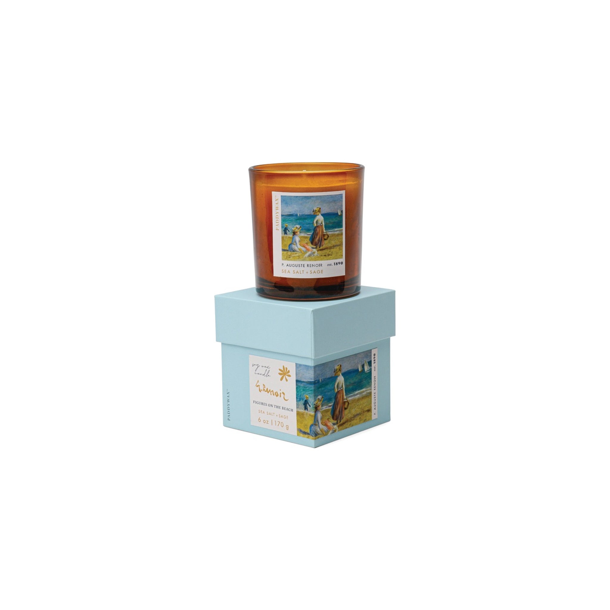This amber glass candle features the Renoir's signature and a work of art and contains fragrances inspired by the essence of the masterpiece. This candle makes for an excellent holiday gift and the gift box makes wrapping easy! The work featured is Pierre-August Renoir's Figures on the Beach. The scent is Sea Salt & Sage that has a fresh, airy and salty fragrance with notes of ocean air, lime, lemon, sea moss, lily and driftwood.
