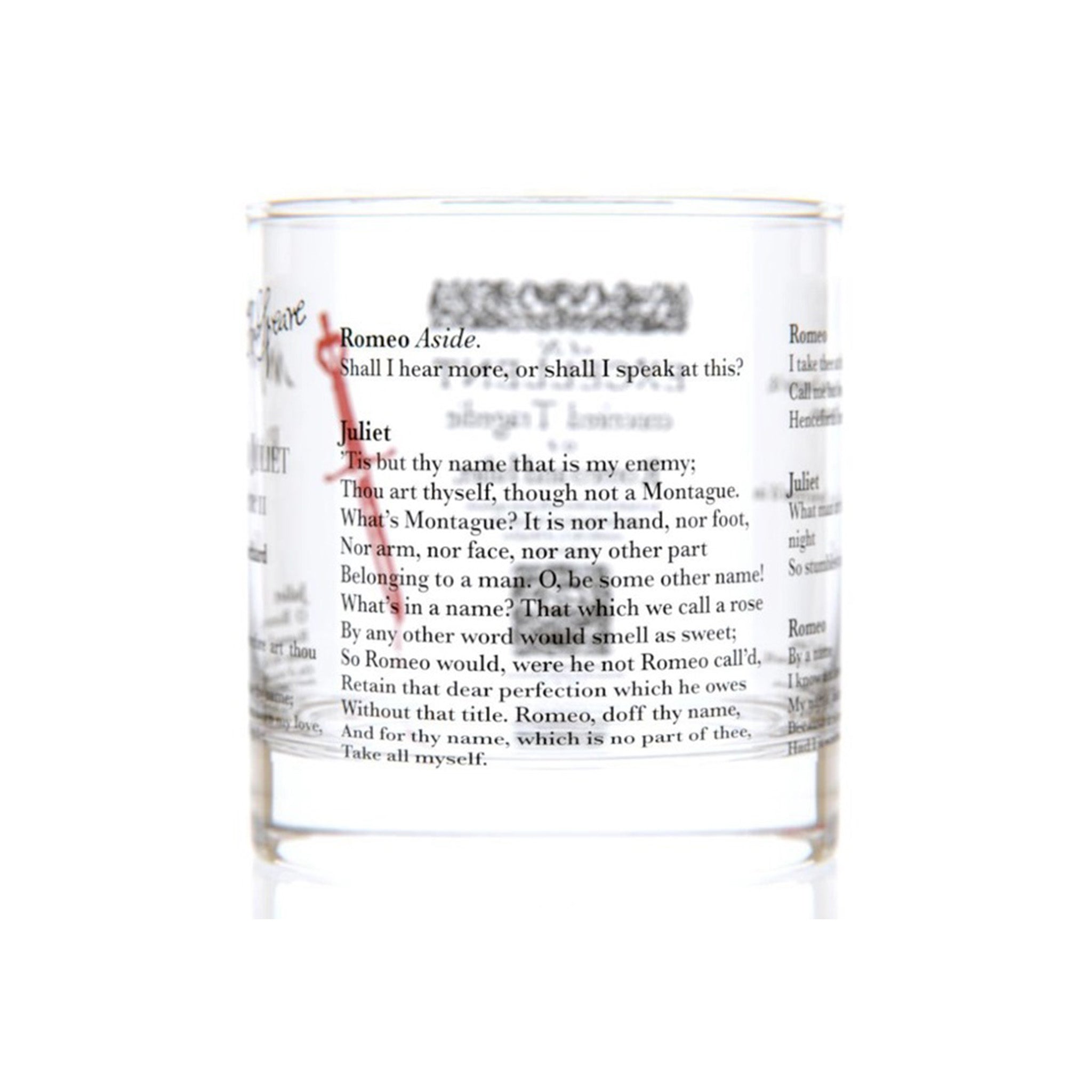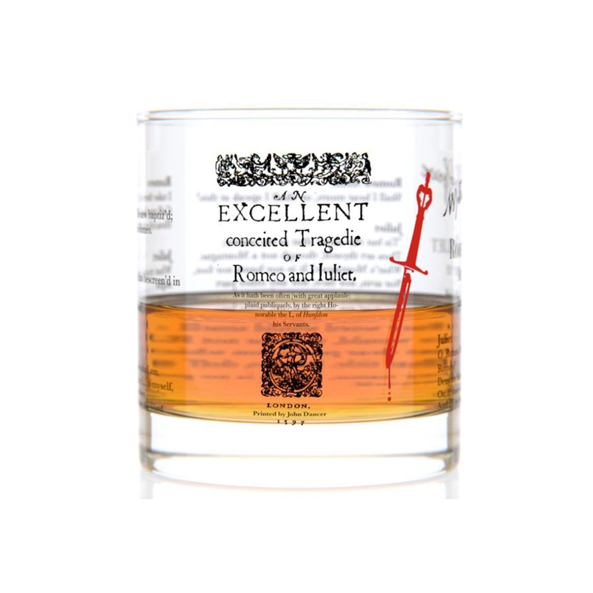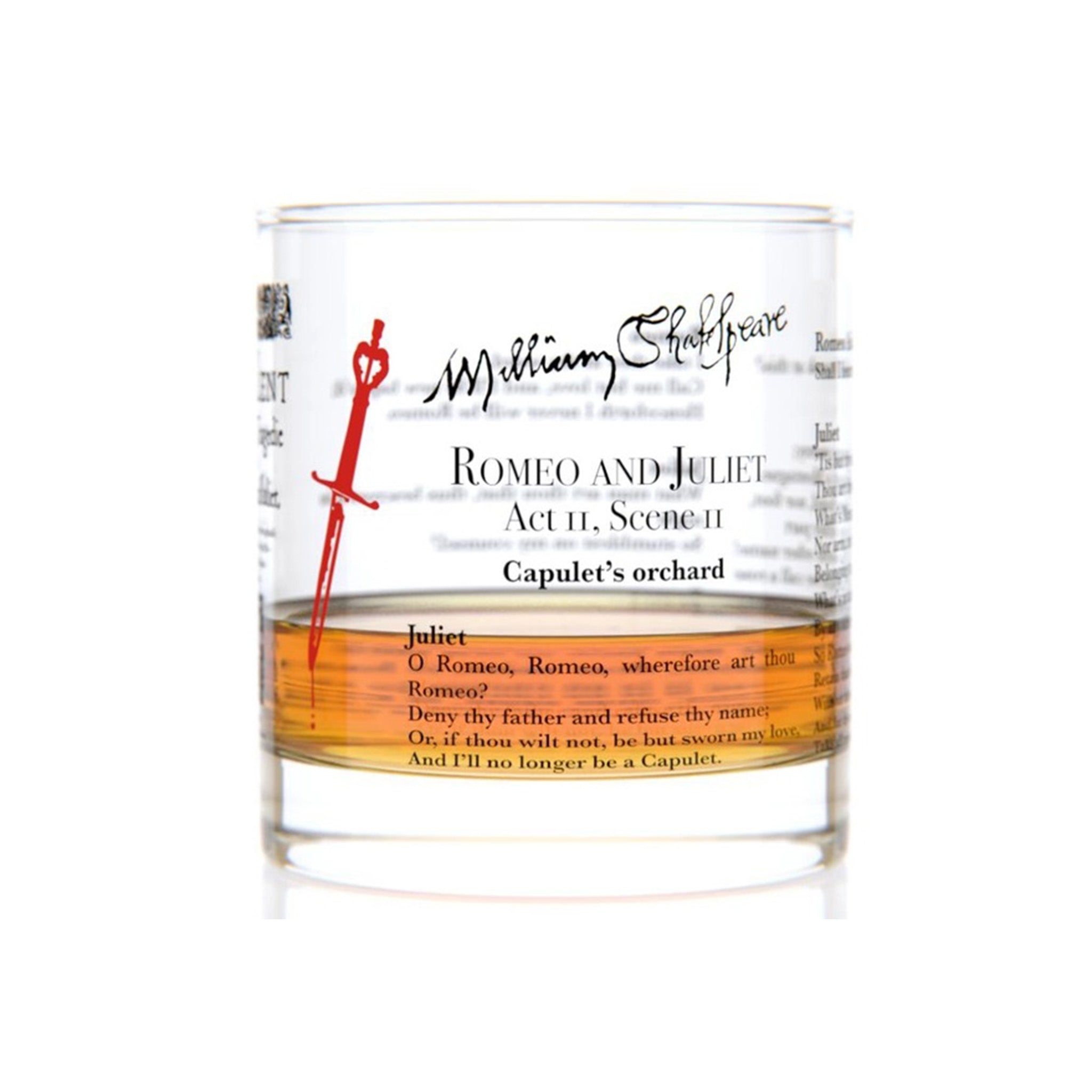 Tragedy and romance, this glass has it all! This 11 oz. rocks whiskey glasses showcases artwork from the 1597 first printing of William Shakespeare's Romeo & Juliet, and the famous scene from the garden: "O Romeo, Romeo, wherefore art thou Romeo?"