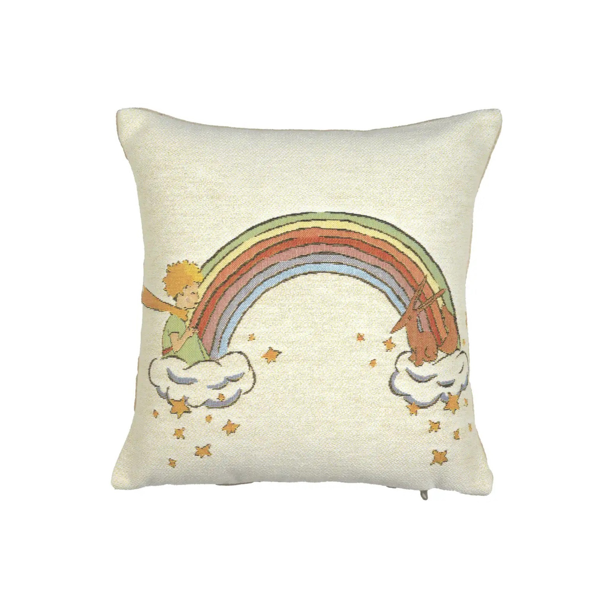 Cherish this cuddly pillow as much as the story of The Little Prince is beloved around the world! Featuring and adorable depiction of the Little Prince and the Fox gazing at each other across a rainbow, this woven tapestry pillow is sure to add whimsy to any home décor.