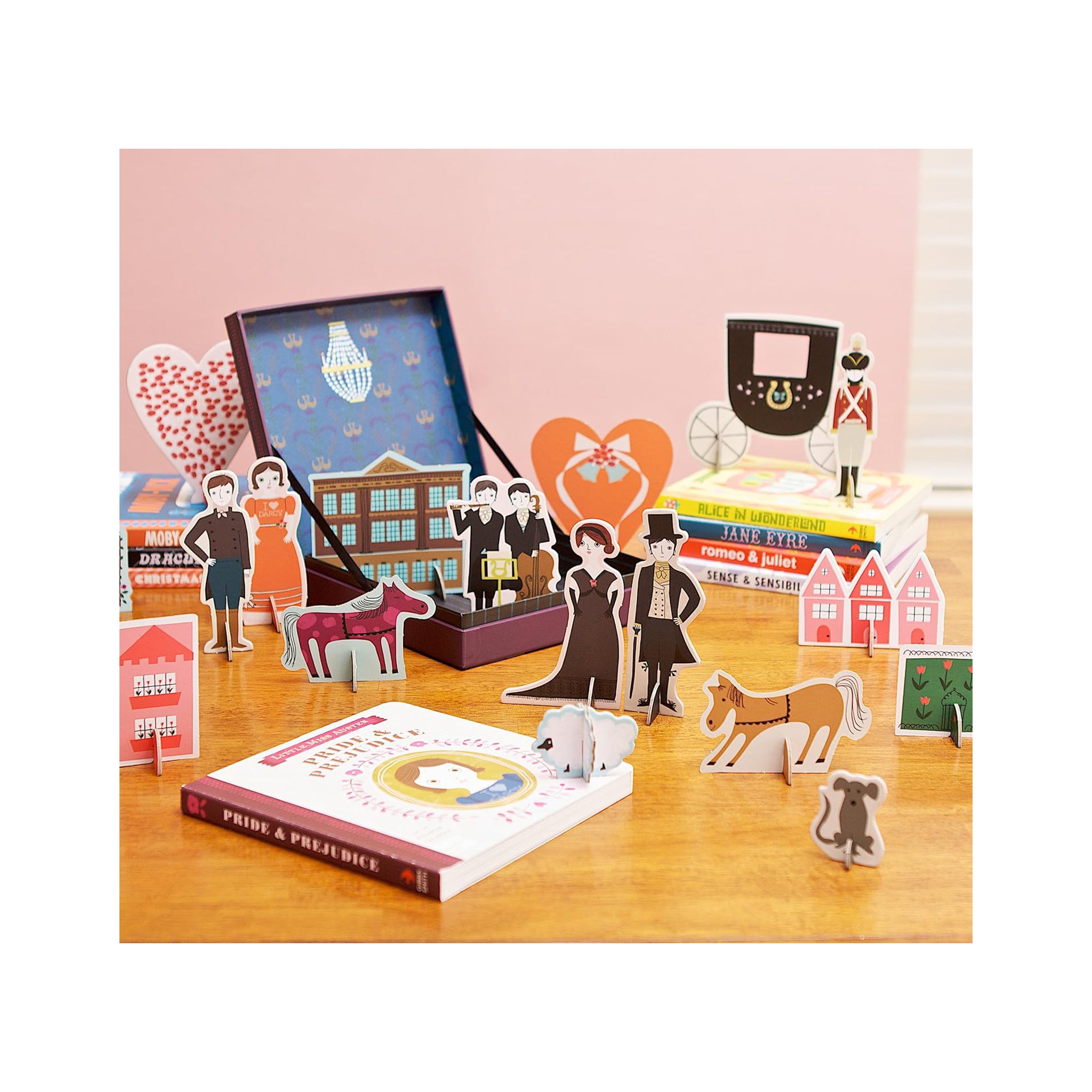 With 7 punch-out cards featuring the characters and scenes from Pride & Prejudice: A BabyLit® Counting Primer and a box to use as a stage set, you can turn Jane Austen’s classic into hours of fun! Stroll in an English village with Mr. Darcy and Mr. Bingley, act out four marriage proposals, march the soldiers in uniform, or set up a lovely English village with Pemberley, Longbourn, and Netherfield. Introduce your little lit-o-phile into the world of drama by setting the stage with Jane Austen’s classic storyline. Includes sturdy box for storage and play.