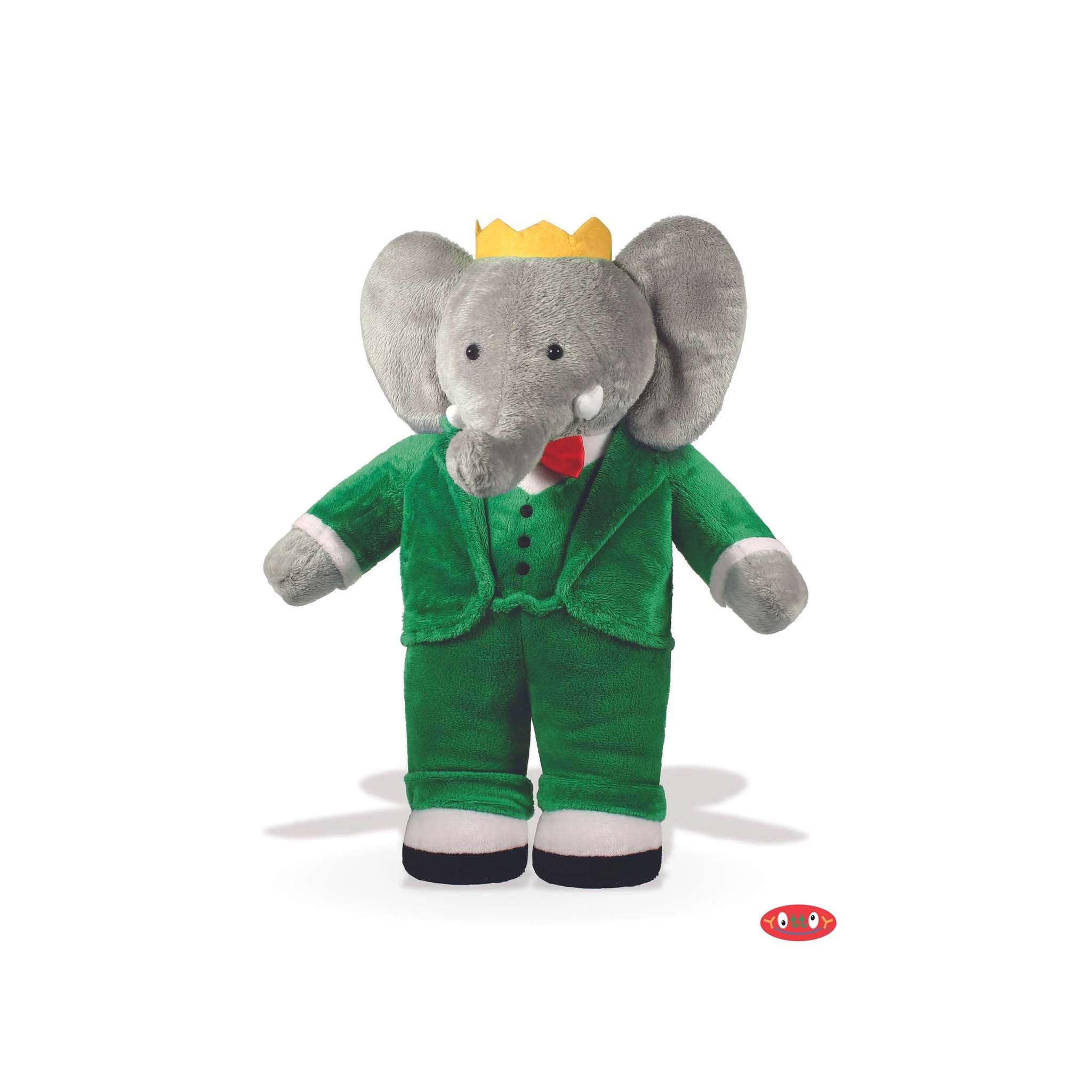 This classic Babar Plush is dapperly dressed in his signature green suit made of luxurious soft velour, complemented with a red satin bowtie, white cuffs, and round black felt buttons. This soft plush pachyderm stands tall in black shoes, white spats, and a golden felt crown atop his head.