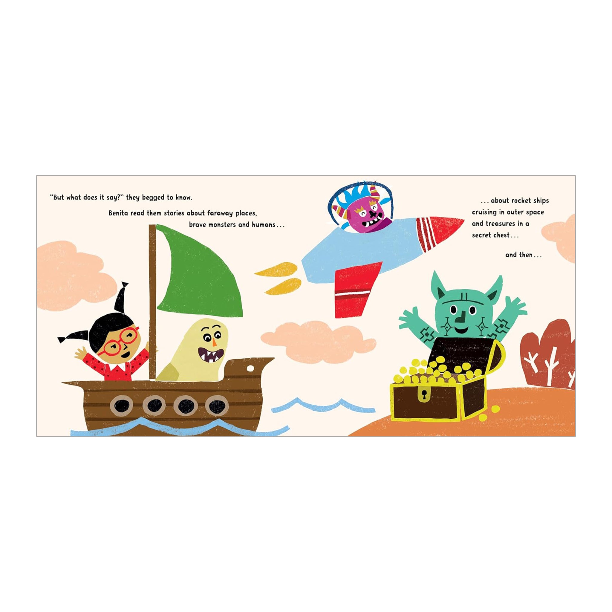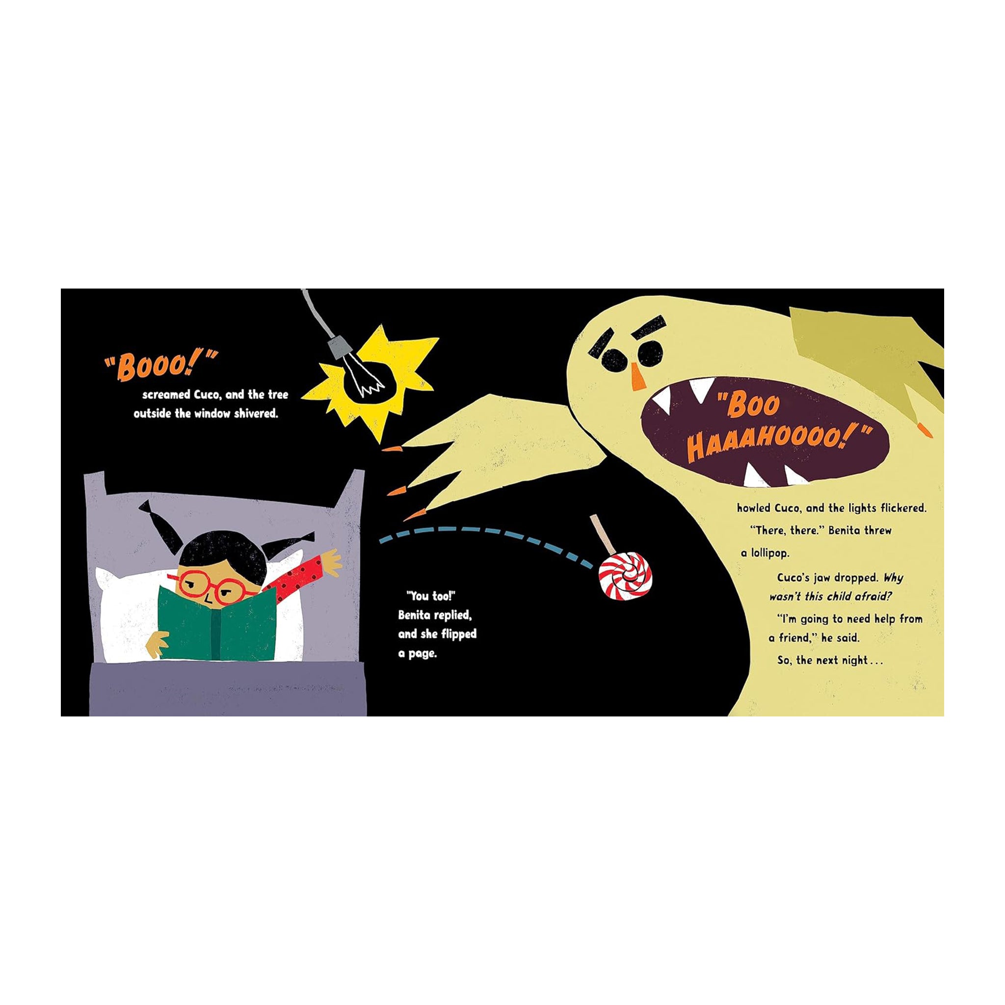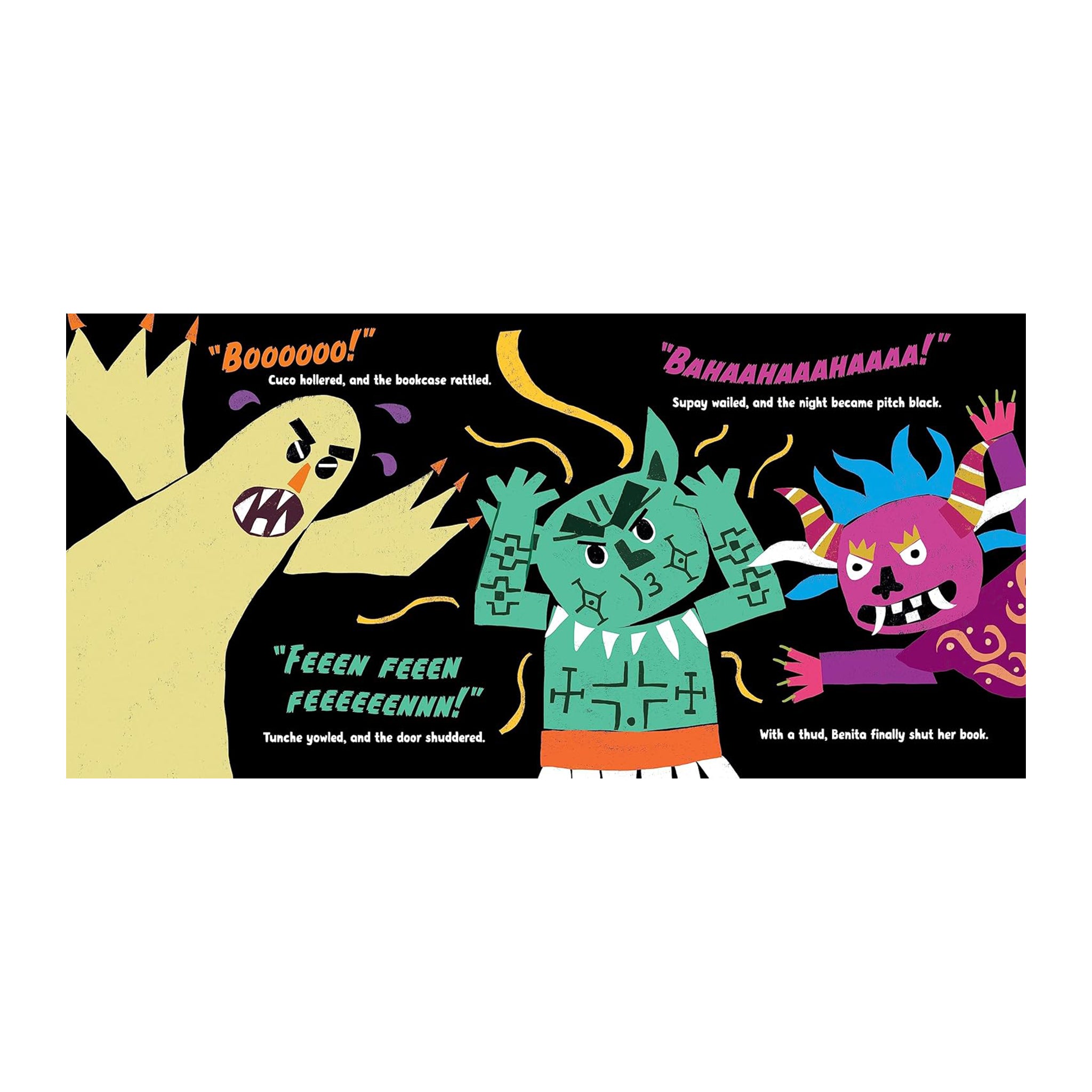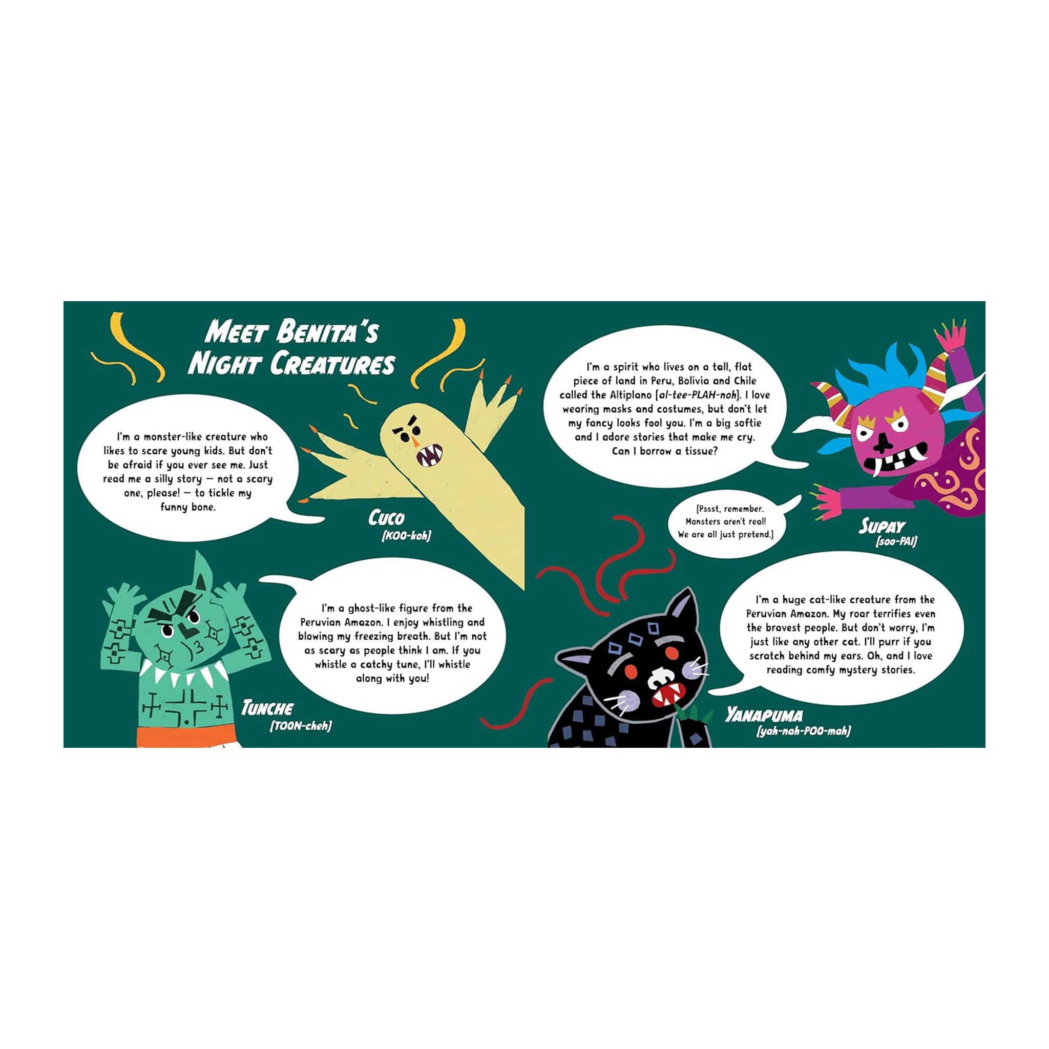 On a dark, dark night, Benita is just settling in to enjoy a nice book before bedtime when all of a sudden... Boo! Spooky creatures from Peruvian lore jump keep interrupting her! To the creatures' disbelief, she doesn't look up from her book. Why isn't Benita afraid? Why is she so cranky? And what is this thing called a book? This humorous celebration of bedtime reading puts a global twist on taking the “scary” out of monsters.
