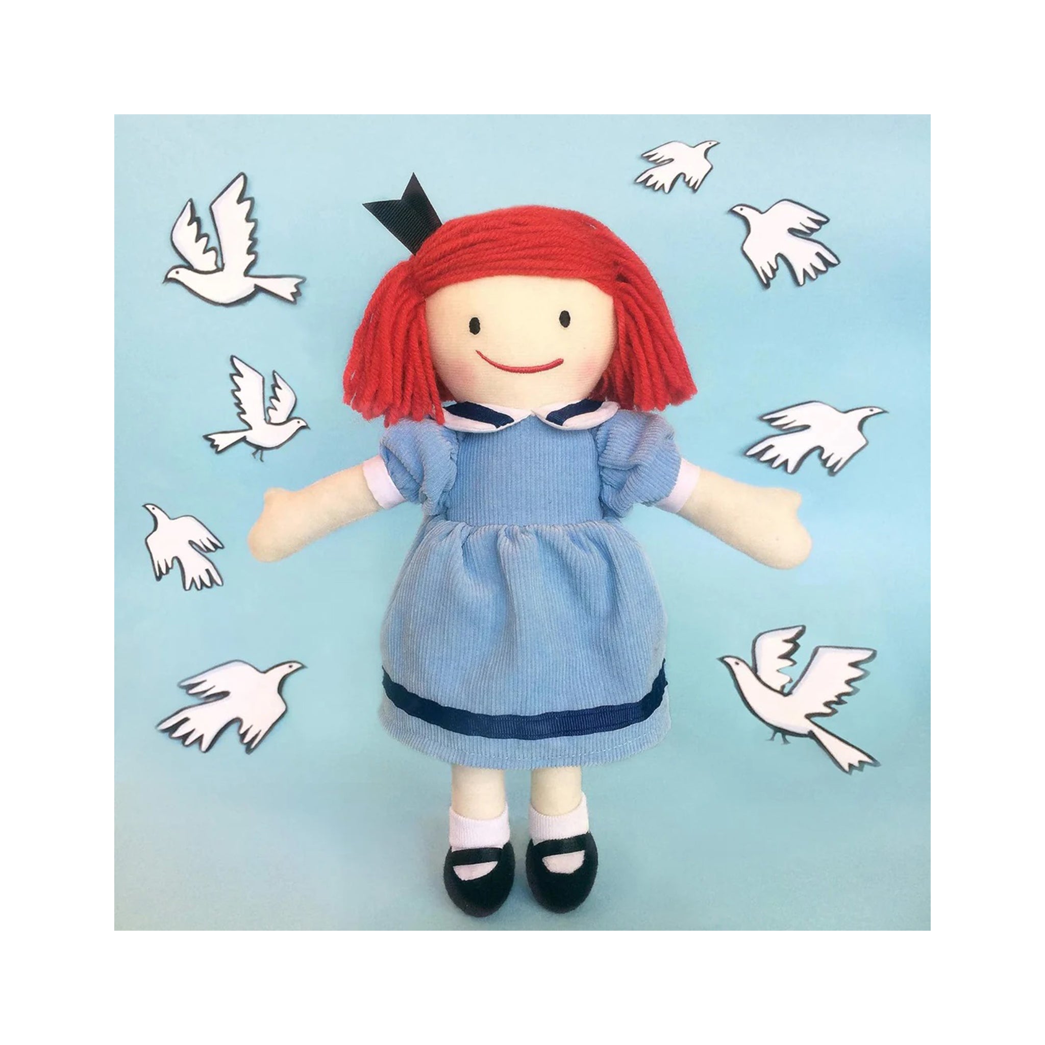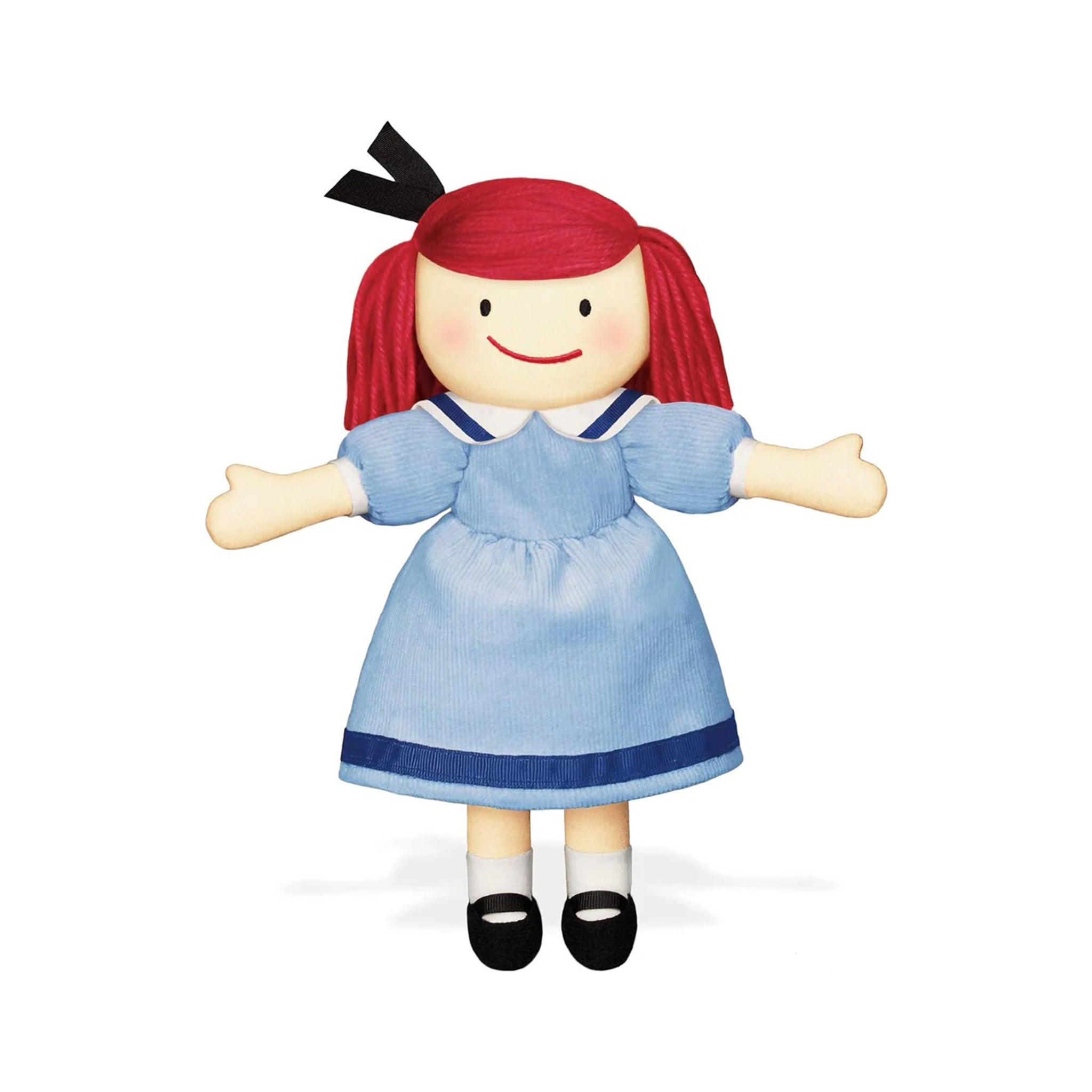 Madeline steps out of her books and into children’s arms as their very own soft doll. Madeline plush doll comes to life dressed in a soft fine-wale corduroy sailor dress, detailed with black grosgrain ribbon and a white sailor collar. Great care was taken in capturing every exquisite detail from her familiar embroidered features, appendix scar and blush cheeks, to her classic red yarn hair. This Madeline plush is sure to become a beloved friend and partner in play.