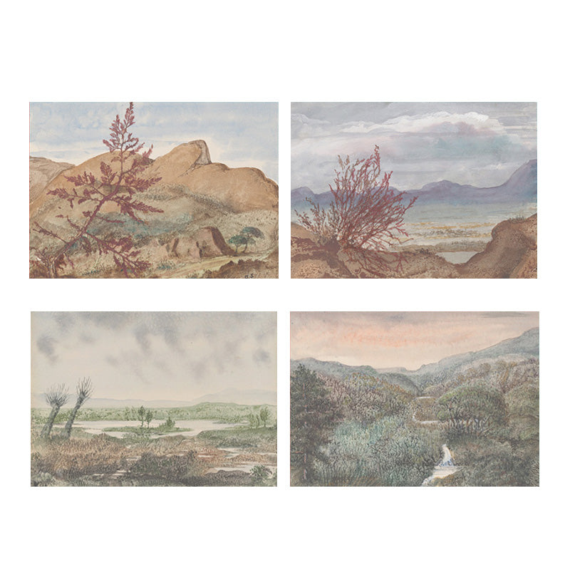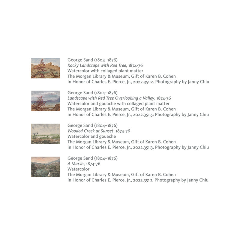 Sand experimented with watercolor in the 1870s. She dripped pigment onto thick paper and pressed the surface with another sheet, which she had dampened. She then pulled the papers apart, creating a texture reminiscent of dense foliage, and transformed these haphazard spots into imagined scenes of forests, mountains, and lakes. Sand referred to the results as “crushed” or “dendritic drawings”— evoking the effect of the finished works using the Greek word for “tree.” She sometimes pasted colorful vegetal matter within her compositions. The scale and texture of these organic elements add an almost surreal note of play to the scenes, reminding us that they are creative experiments rather than studied landscapes.