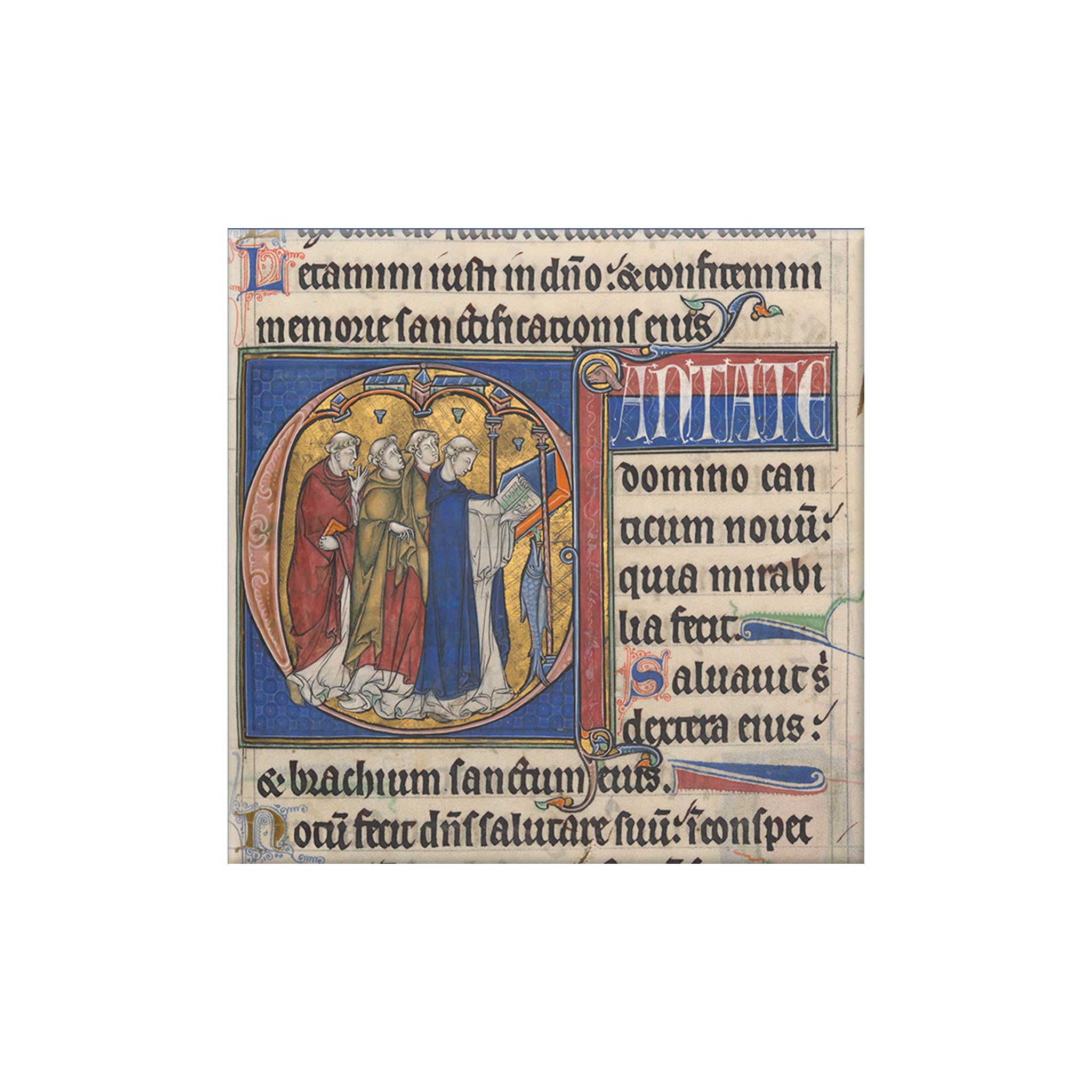 Cantate Domino canticum novum—“Sing to the Lord a new song.” This psalm, 97, began the division sung at Matins on Saturdays. It was traditionally illustrated with an image of clerics chanting.