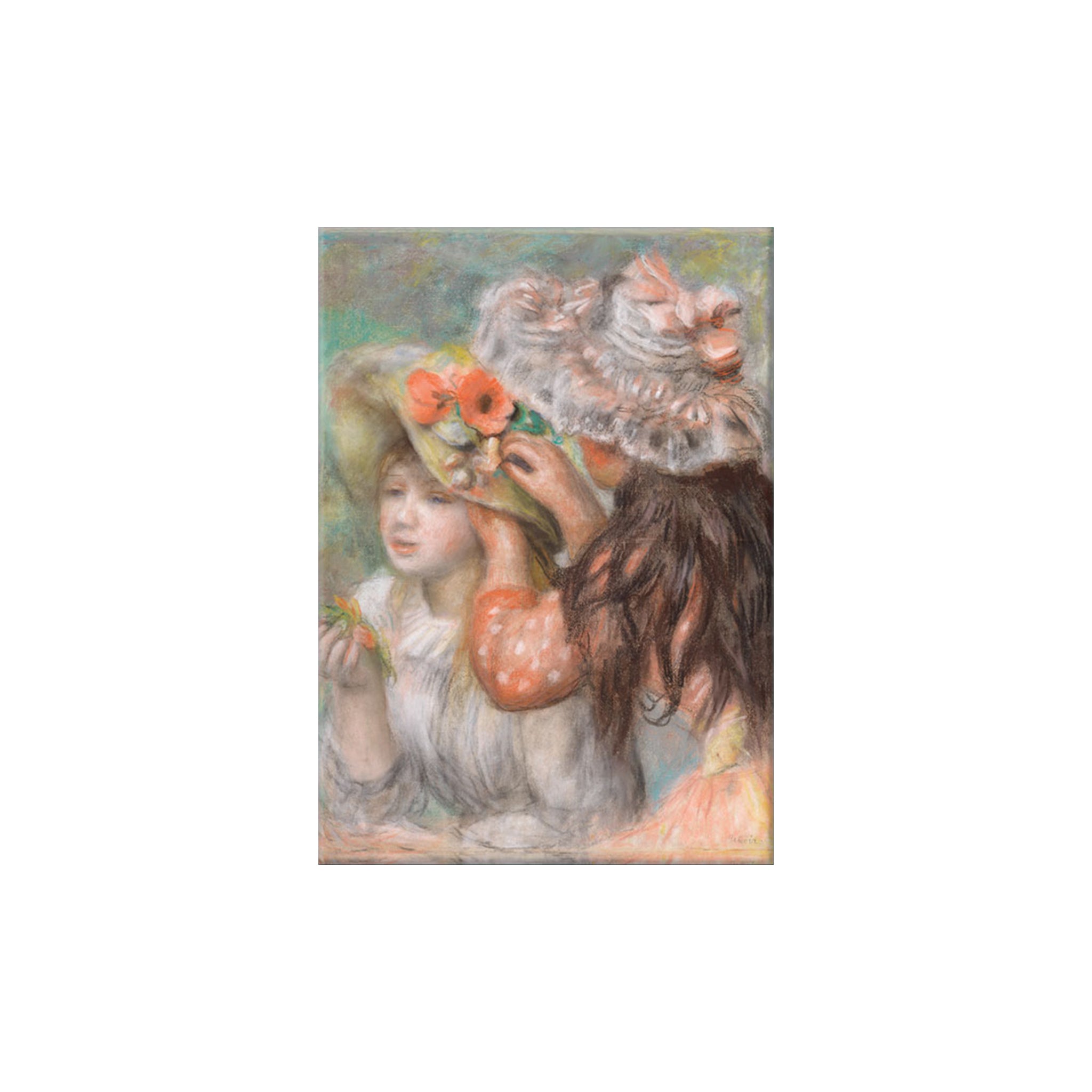 The lovely pastel drawing from the Nelson-Atkins Museum of Art, The Flowered Hat also known as Pinning the Hat by Renoir depicts Julie Manet and her cousin Paulette Gobillard.