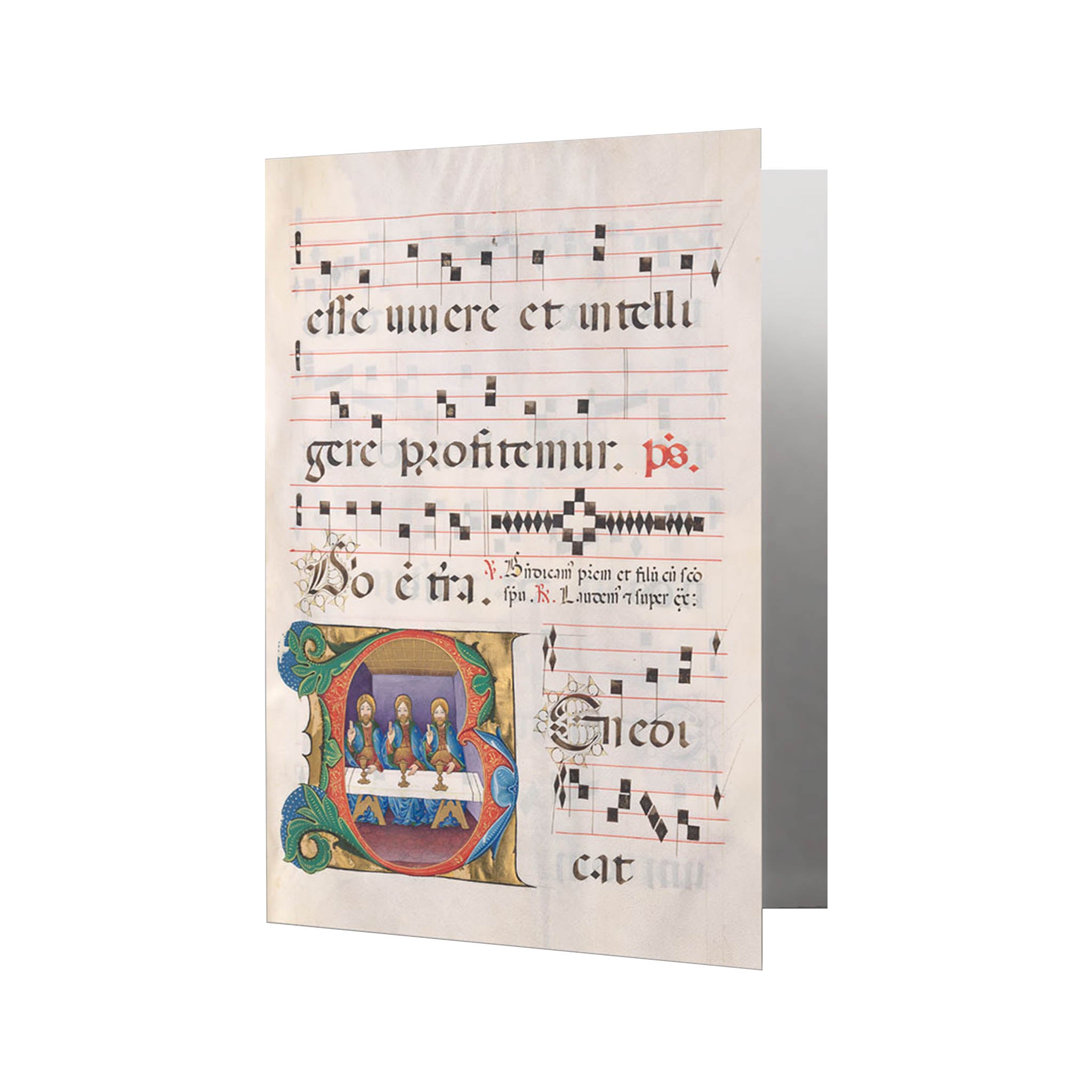 Highlighting a page from a grand set of choir books commissioned between 1470 and 1495 for a cathedral at Lodi by Carlo Pallavicino, marquis of Cremona, this illumination within the Antiphonary come from the Feast of Trinity Sunday, the last feast in the book that begins with Easter. Trinity Sunday features an initial B of "Benedicat nos Deus..." (Bless us, O Lord); in the image, the three persons of the Trinity are represented identically.