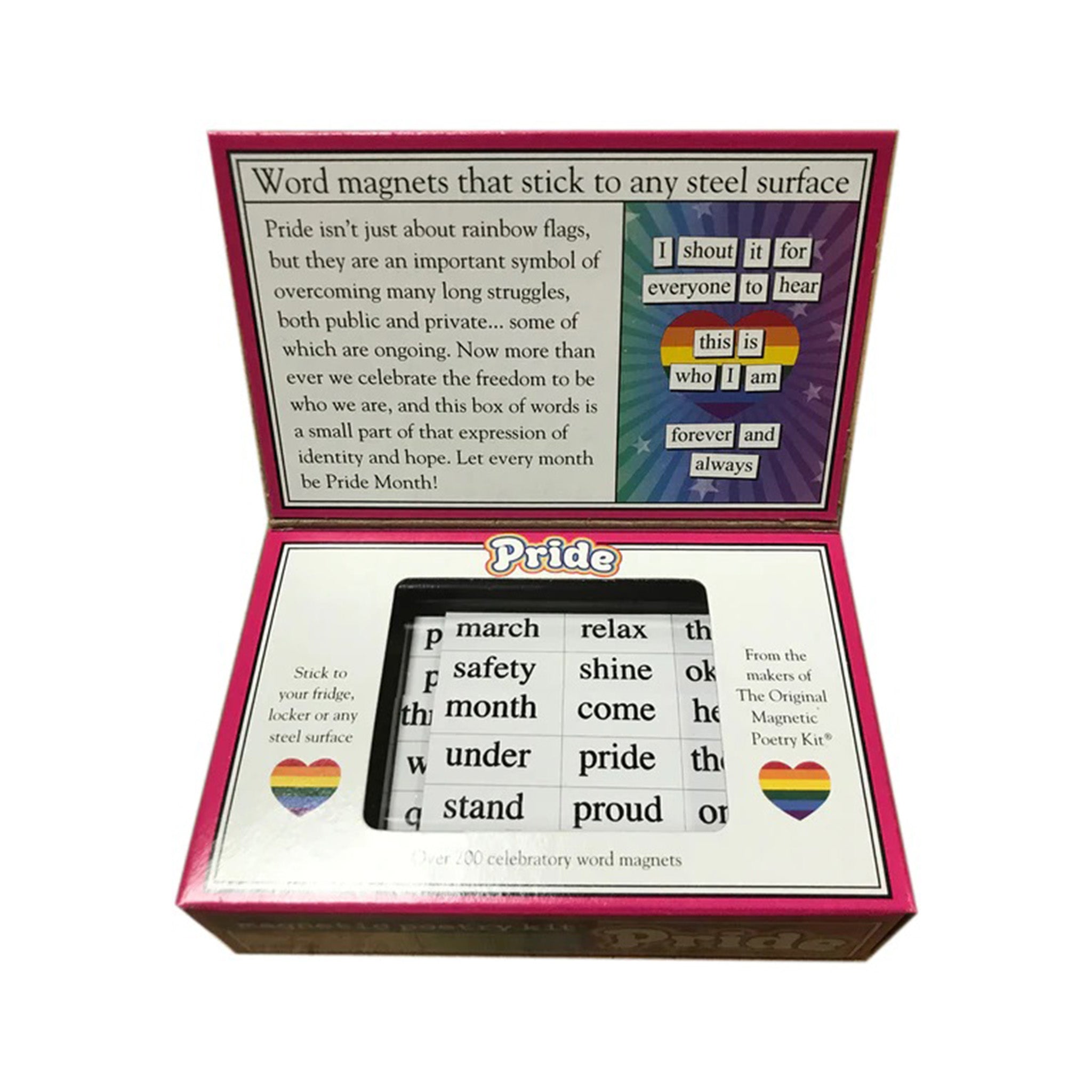 Over 200 word magnets that are proud of who they are. Includes words like celebrate, believe, freedom, self, together, and pride, this kit is an excellent tool for creatives of all shapes, sizes and ages! Use this tailored assortment of words to develop your own unique poetry or sayings with a spirit of pride.