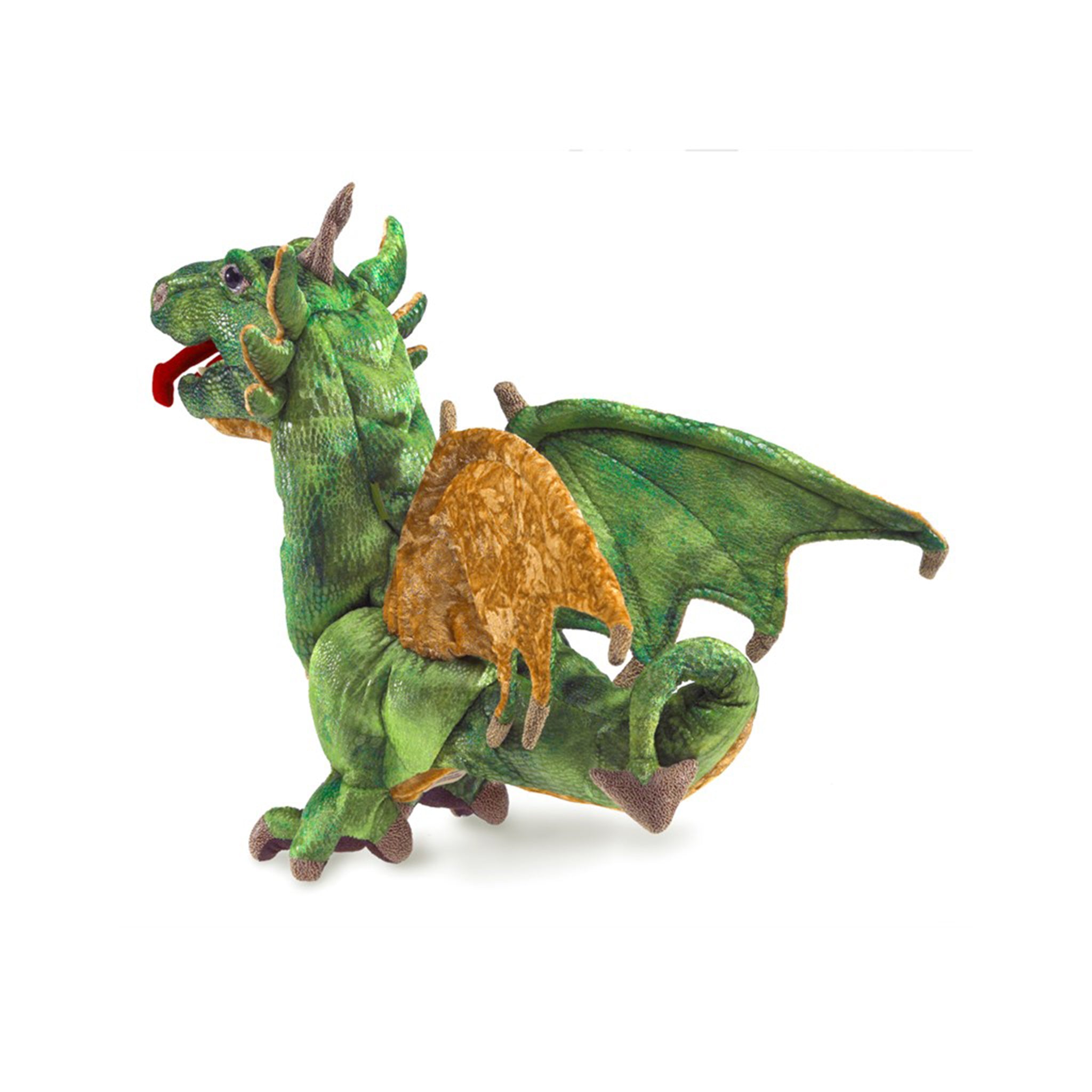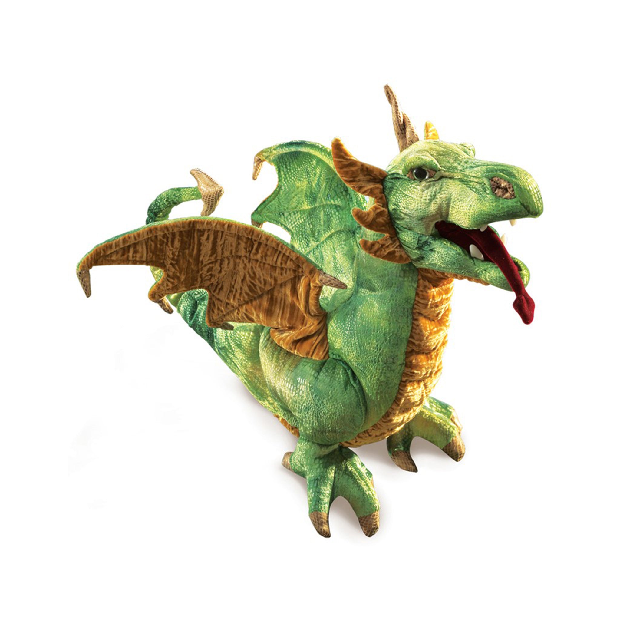This award-winning dragon puppet is a timeless symbol of heraldry, the Wyvern Dragon. It's easy to manipulate the velvety mouth and tongue of this scaly green iconic beast and have fun for ages and ages!