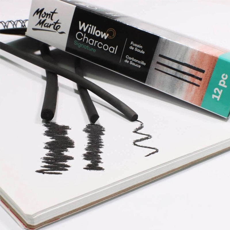 Perfect for intuitive and fluid drawing techniques! This 12 piece pack contains 4 sticks of small, medium and large diameter charcoal. Suitable for all artistic levels. Make sure to spray your finished work with fixative to avoid smudging, or use tissue paper as a divider when storing your work of art.