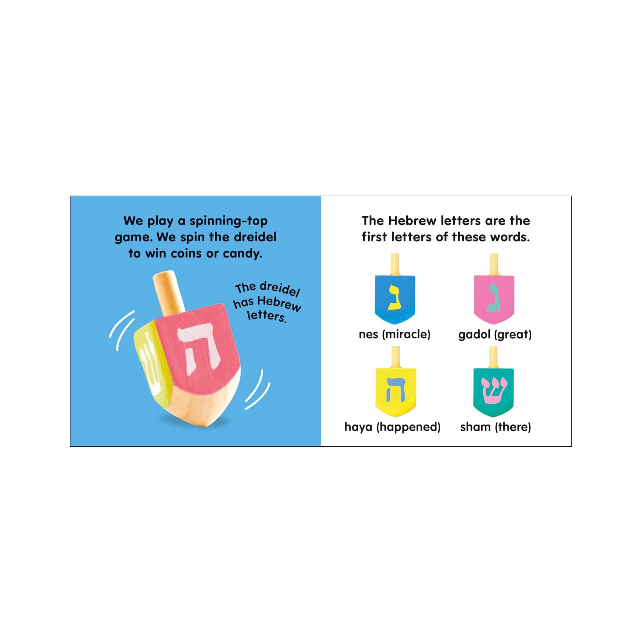 Bold, brightly colored pictures, and short and snappy text is the perfect way to discover Hanukkah together in this delightful book. Celebrate all the elements of this wonderful Jewish festival of lights with your little one, like the spin-the-top dreidel game, shiny chocolate coins, and fun family time with songs to sing and gifts to give and receive!