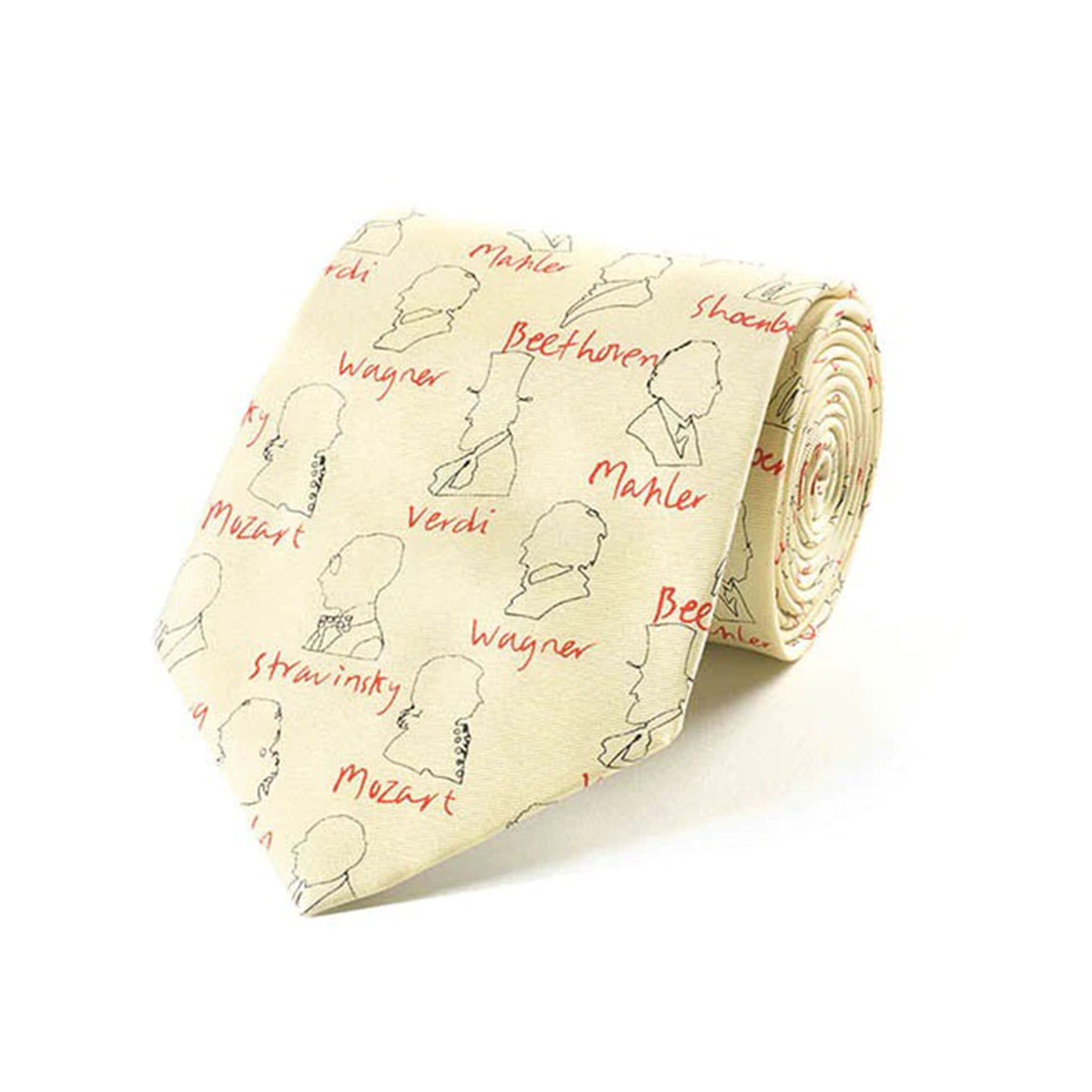The perfect tie for the music-lover! Featuring silhouette sketches of famous composers such as Mozart, Stravinsky, Mahler, Beethoven, and more on this cream silk tie.