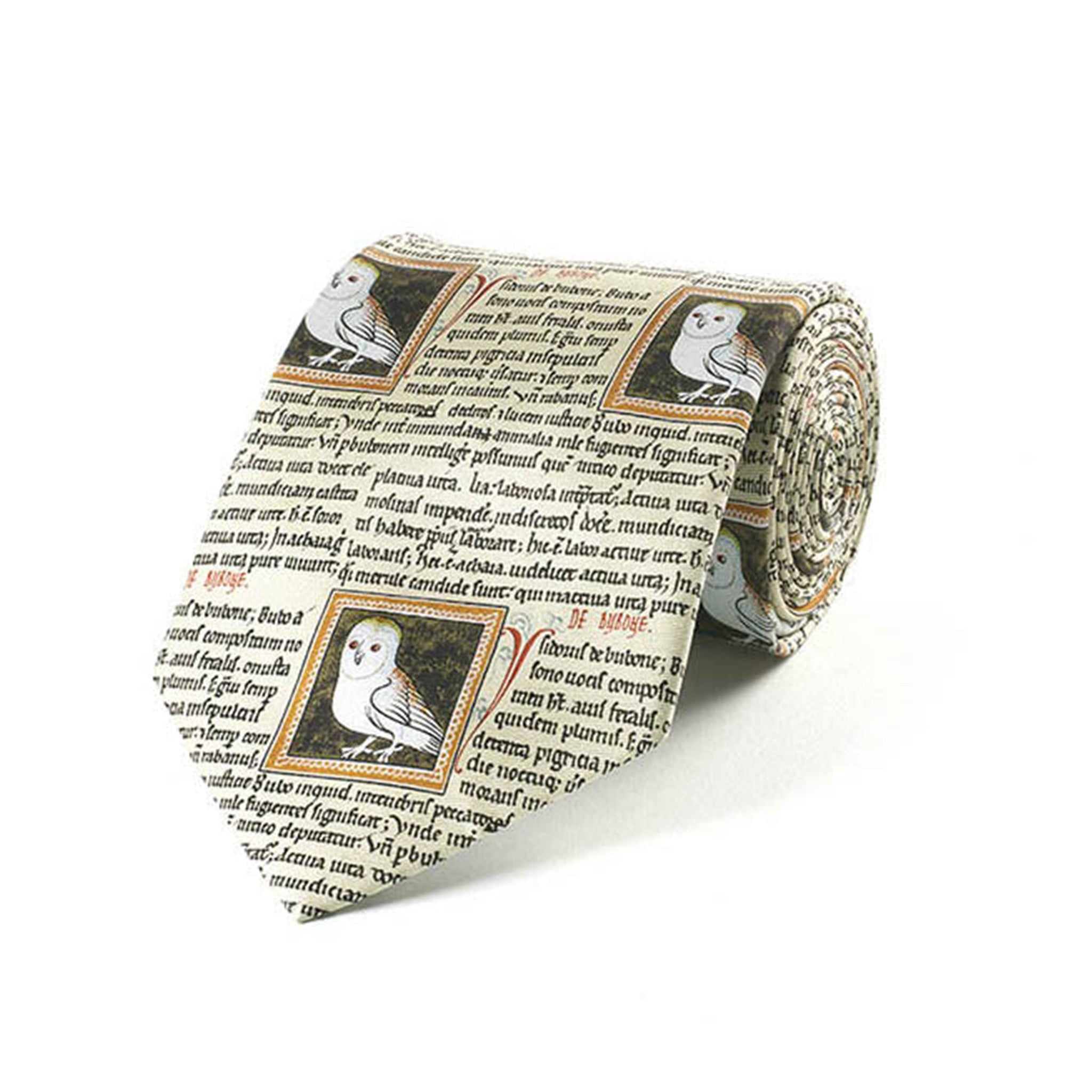 This silk tie comes from the Bodleian Library of Oxford and is inspired by a painting of the owl from the 'Ashmole Bestiary', a manuscript made in England in the early 13th century.